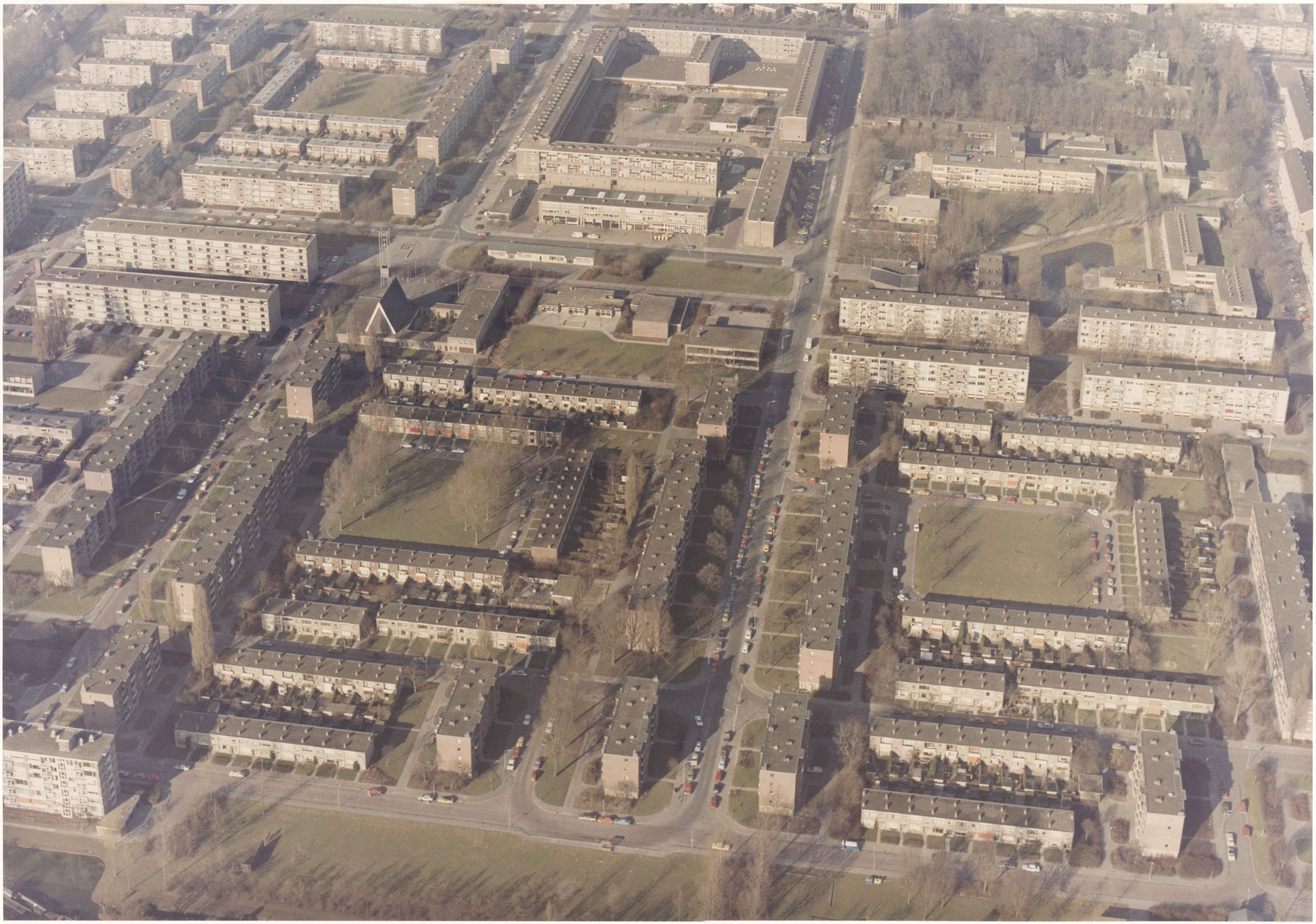 Luchtfoto van een gedeelte van Crabbehof gezien in noordelijke richting. In het midden de Verrezen Christuskerk en bovenin het winkelcentrum.