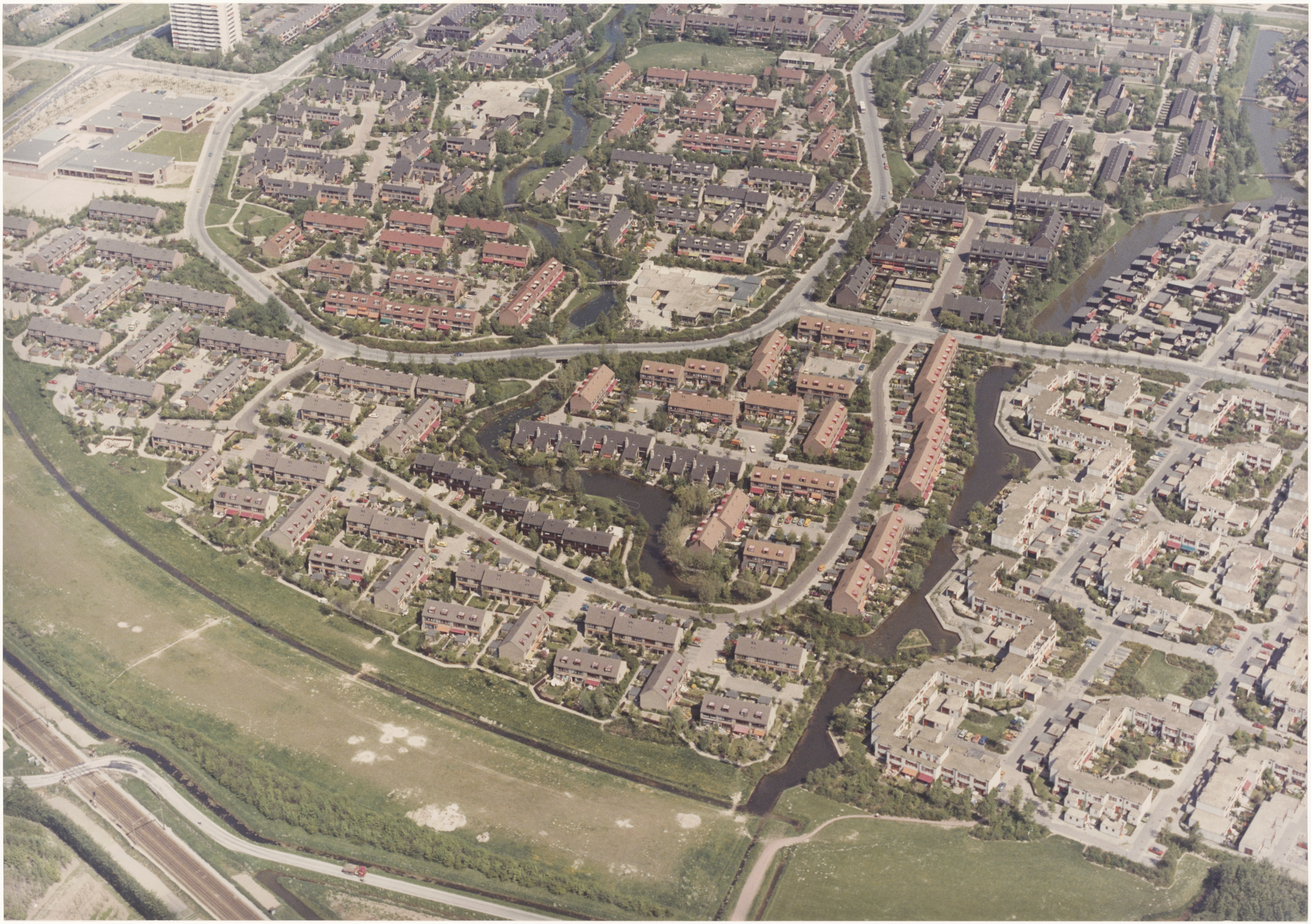 - Luchtfoto van Sterrenburg vanaf de spoorbaan naar het oosten. Waterman ligt iets onder het midden, daar boven de ringvormige Eulerlaan met de aftakking van Assumburg naar rechts.
