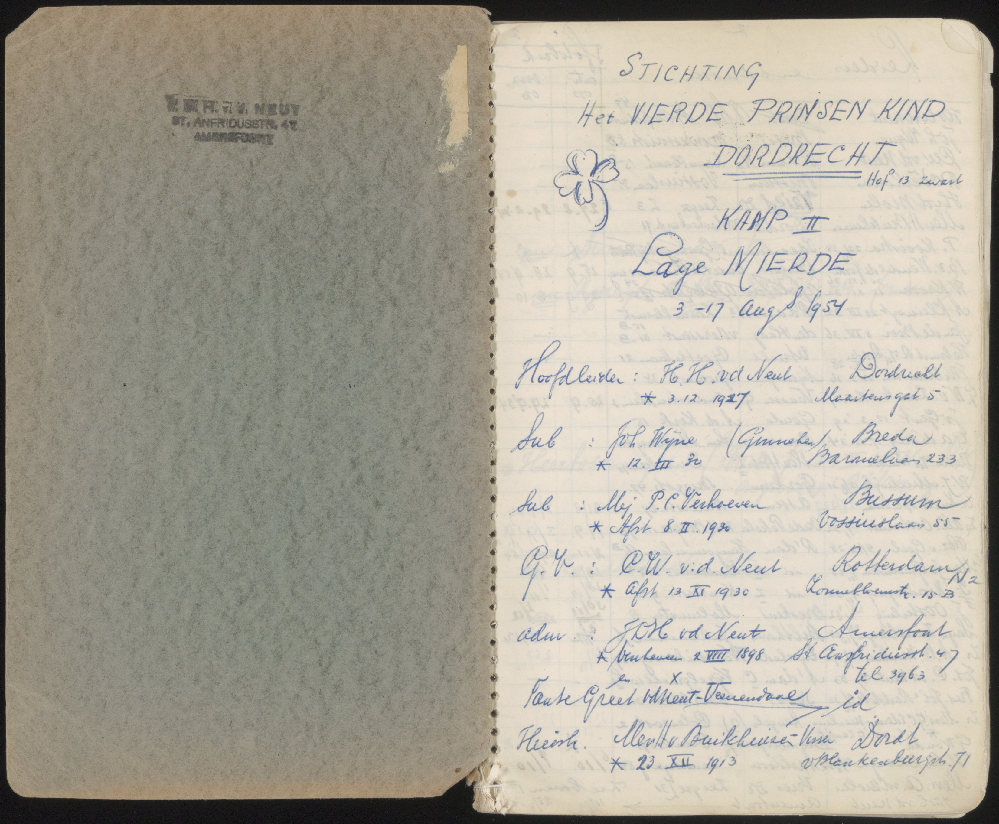 - Openingspagina van een album met administratie en foto's van een kamp gehouden van 3 t/m 17 augustus 1954 voor kinderen van oorlogsslachtoffers van Stichting Het Vierde Prinsenkind (VPK) te Lage Mierde.