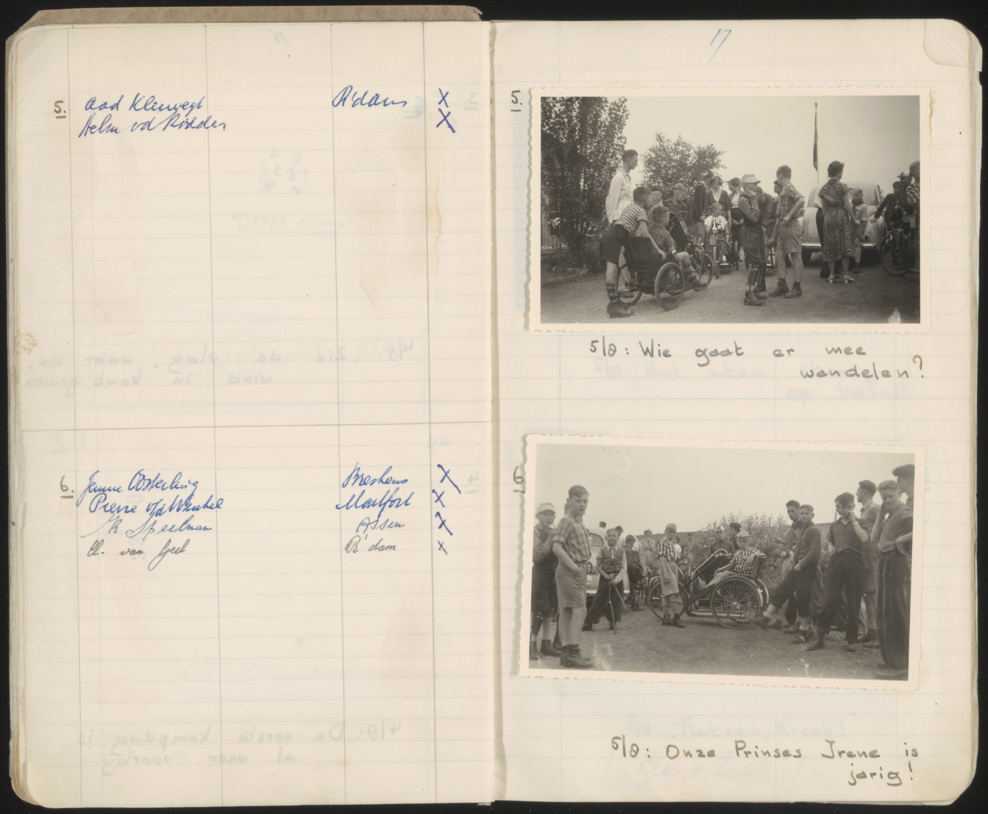 - Links: Nabestellingen van foto's. Rechts: Deelnemers aan een wandeltocht tijdens een kamp gehouden van 3 t/m 17 augustus 1954 voor kinderen van oorlogsslachtoffers van Stichting Het Vierde Prinsenkind (VPK) te Lage Mierde.