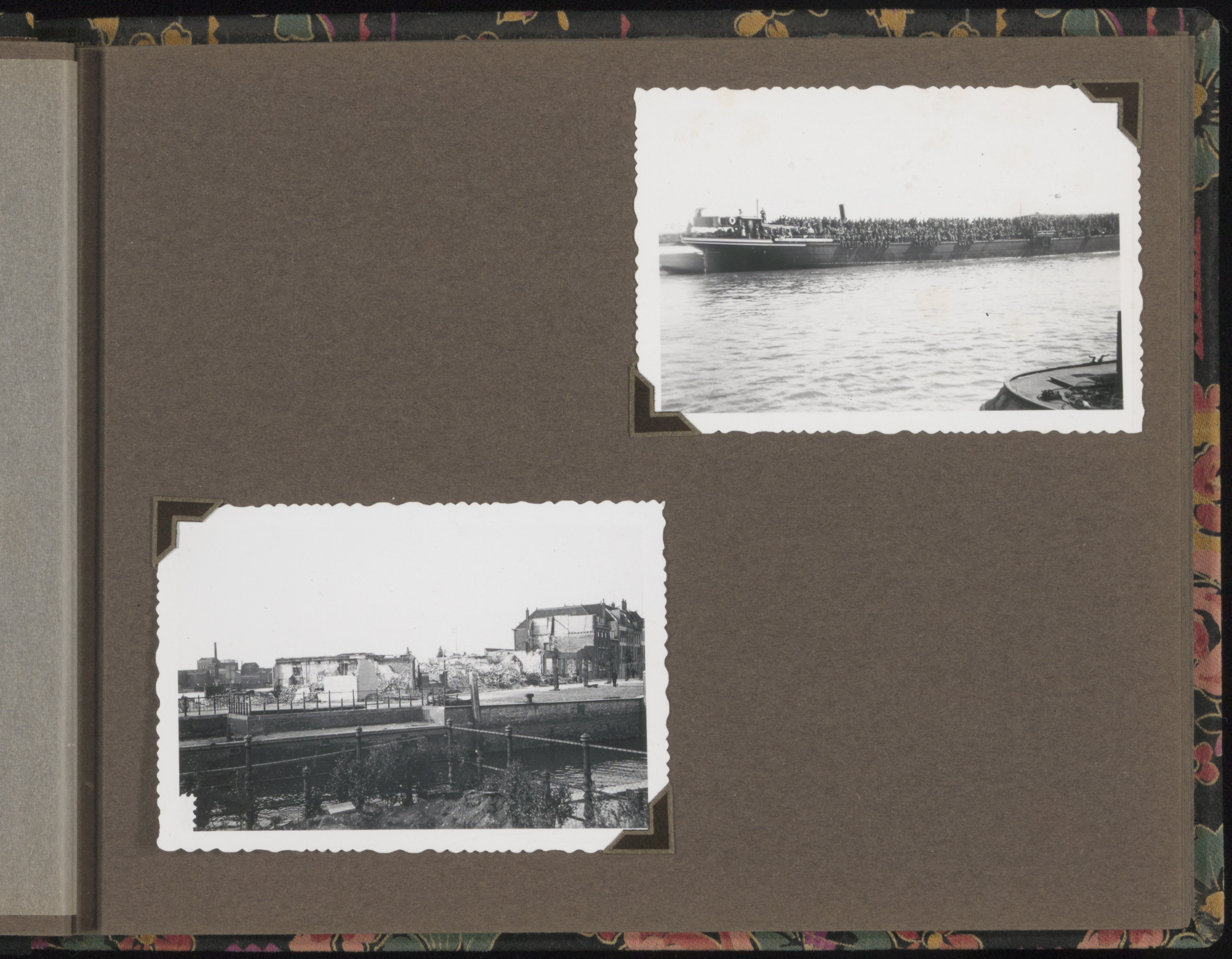 - Boven: Belgische en Franse krijgsgevangenen passeren Dordrecht over de Oude Maas op weg naar Duitsland. Onder: Tijdens de oorlogsdagen van mei 1940 aangerichte schade aan huizen aan de Binnen Kalkhaven bij de Draaibrug.