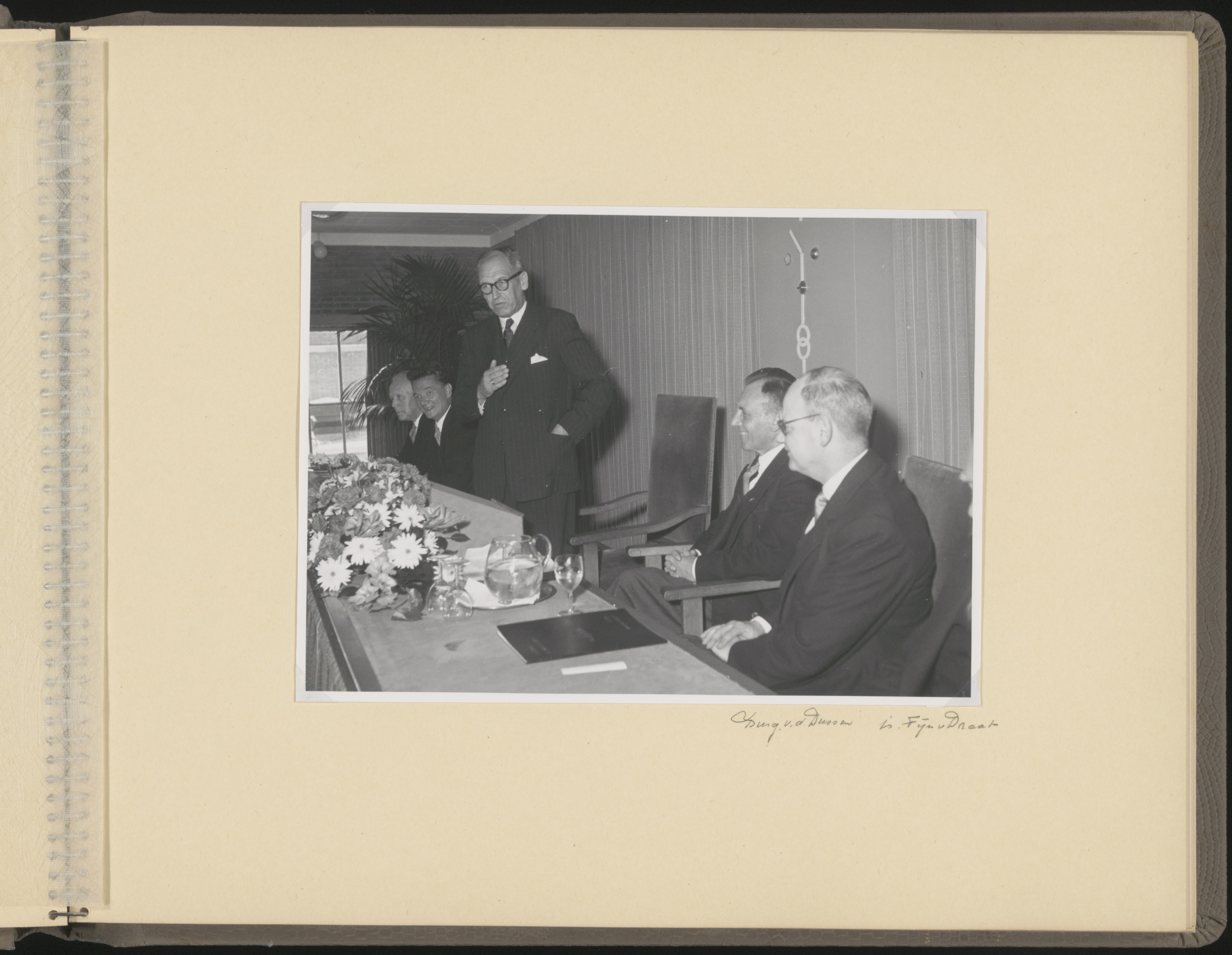 - Toespraak bij de opening van de Merwedecentrale op de Kerkeplaat. Geheel rechts hoofdingenieur Fijnvandraad, naast hem burgemeester Van der Dussen.