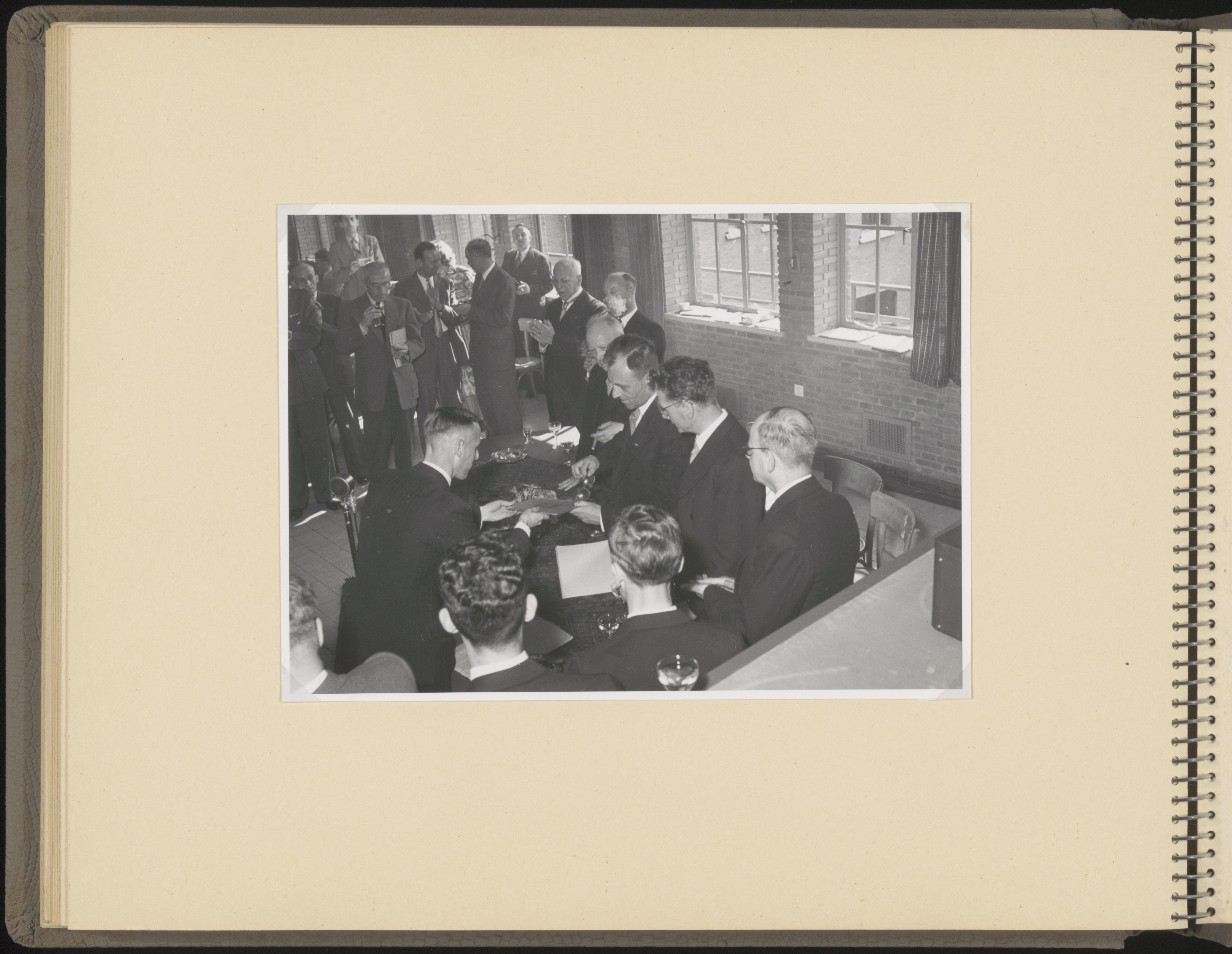 - Aanwezigen bij de opening van de Merwedecentrale op de Kerkeplaat. Onder hen burgemeester Van der Dussen (met bril in de hand) en hoofdingenieur Fijnvandraad (geheel rechts).