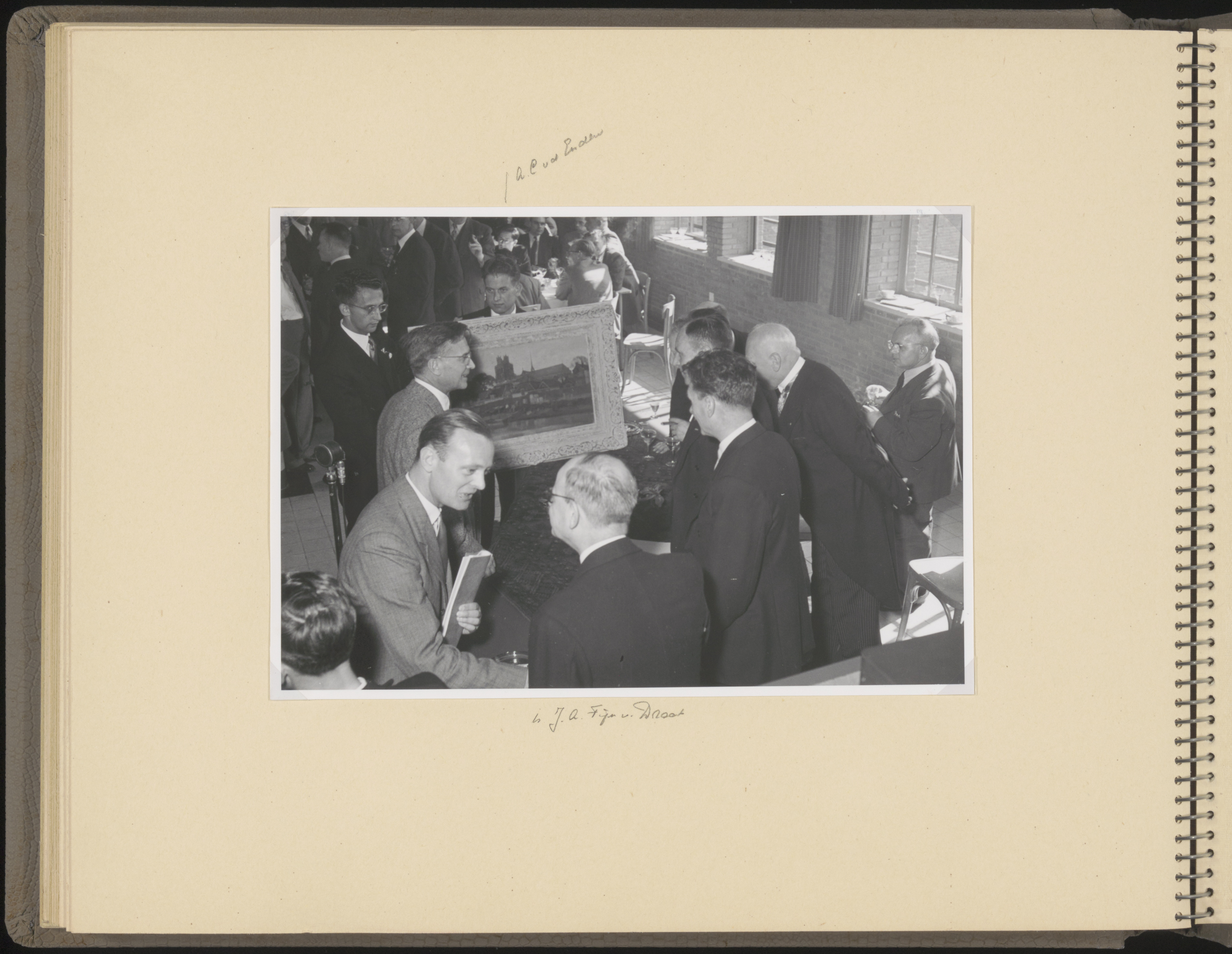 - Aanwezigen bij de opening van de Merwedecentrale op de Kerkeplaat. Burgemeester Van der Dussen staat rechts vooraan bij het schilderij. Rechts achter het schilderij ingenieur Van de Enden. In het midden op de rug gezien hoofdingenieur Fijnvandraad.