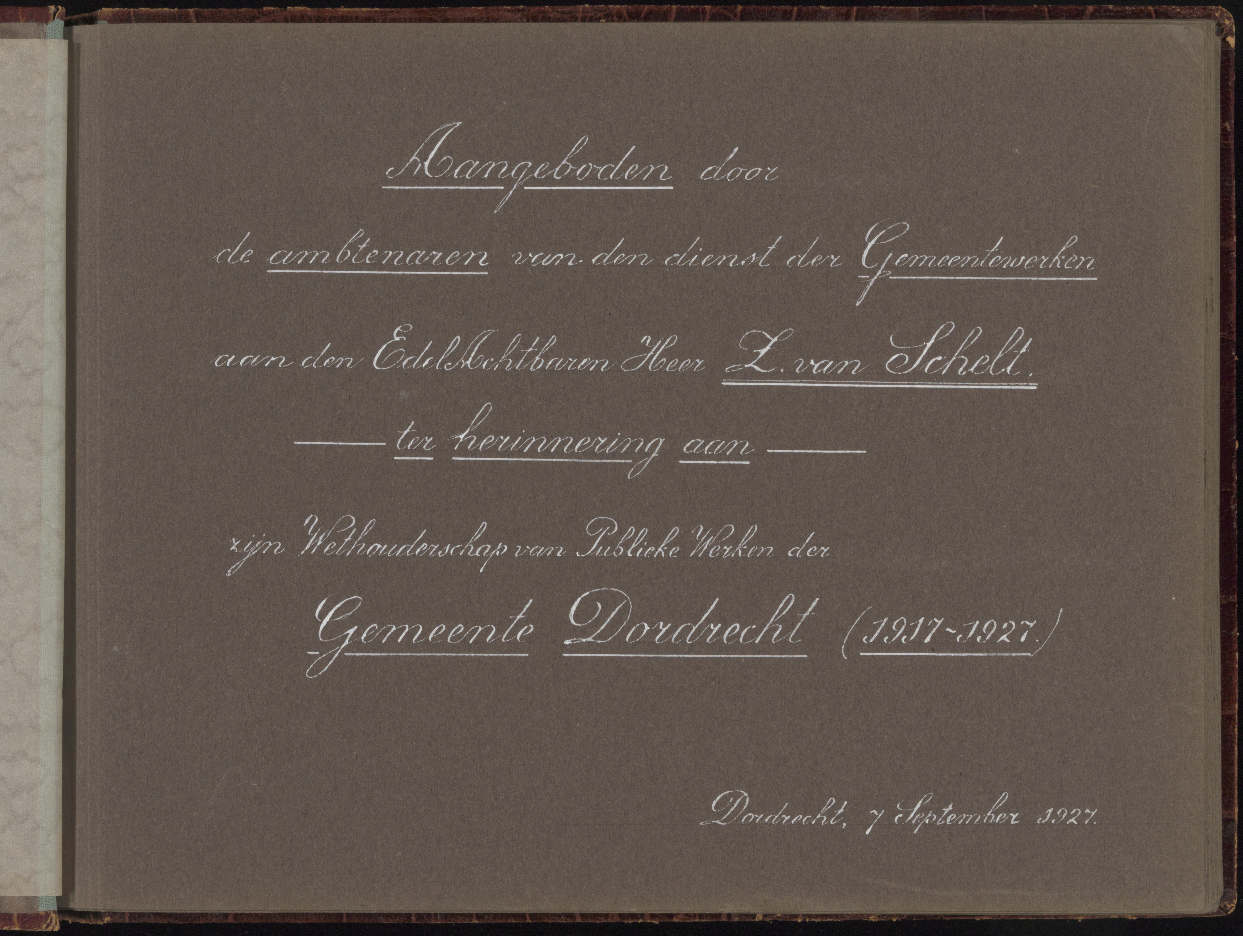 Titelblad van het herinneringsalbum van Z. van Schelt, wethouder van Publieke Werken.