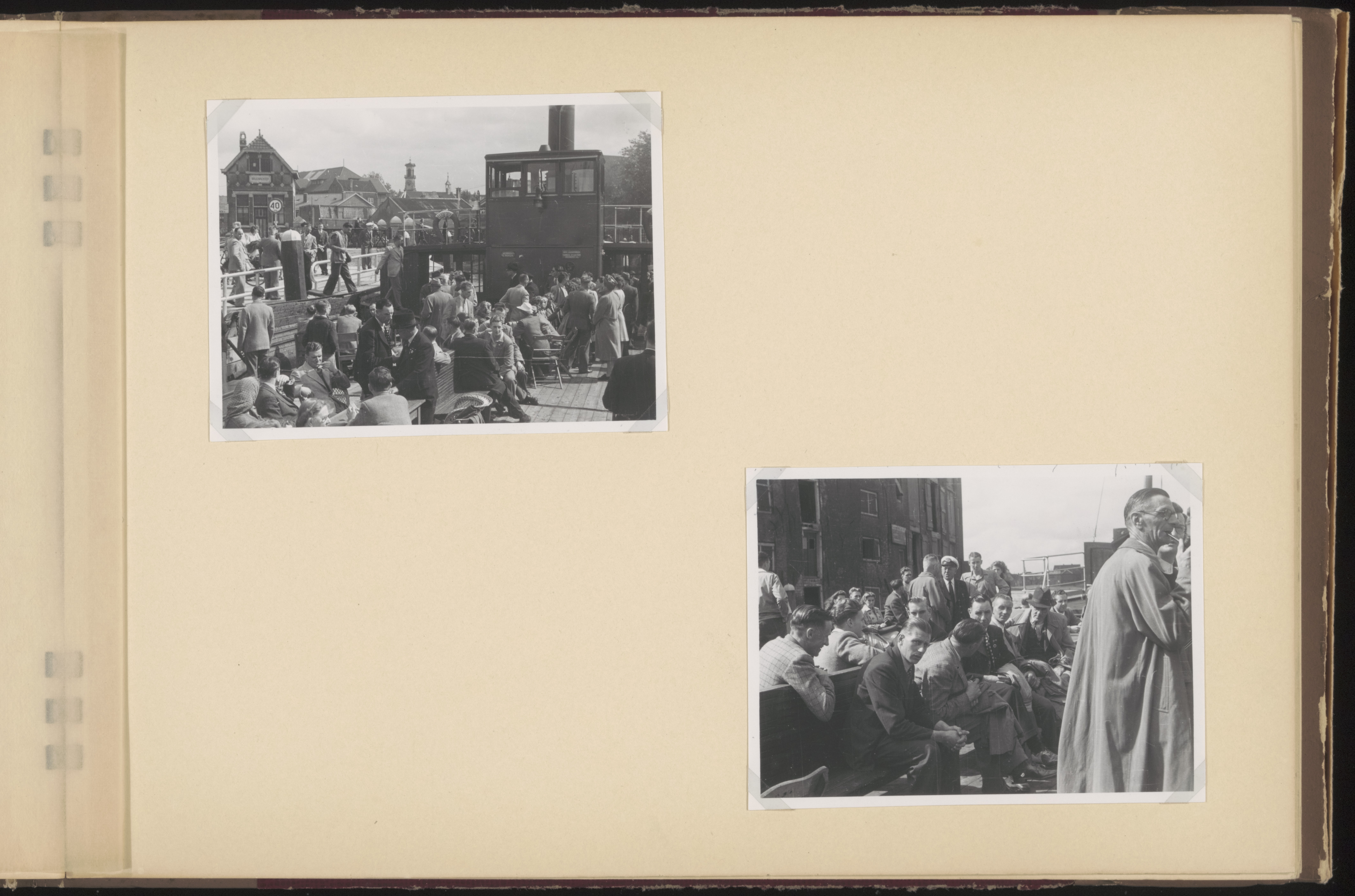 - Groep deelnemers aan de sportuitwisseling Dordrecht en de Engelse zusterstad Hastings op een boot in de monding van de Nieuwe Haven (onder).