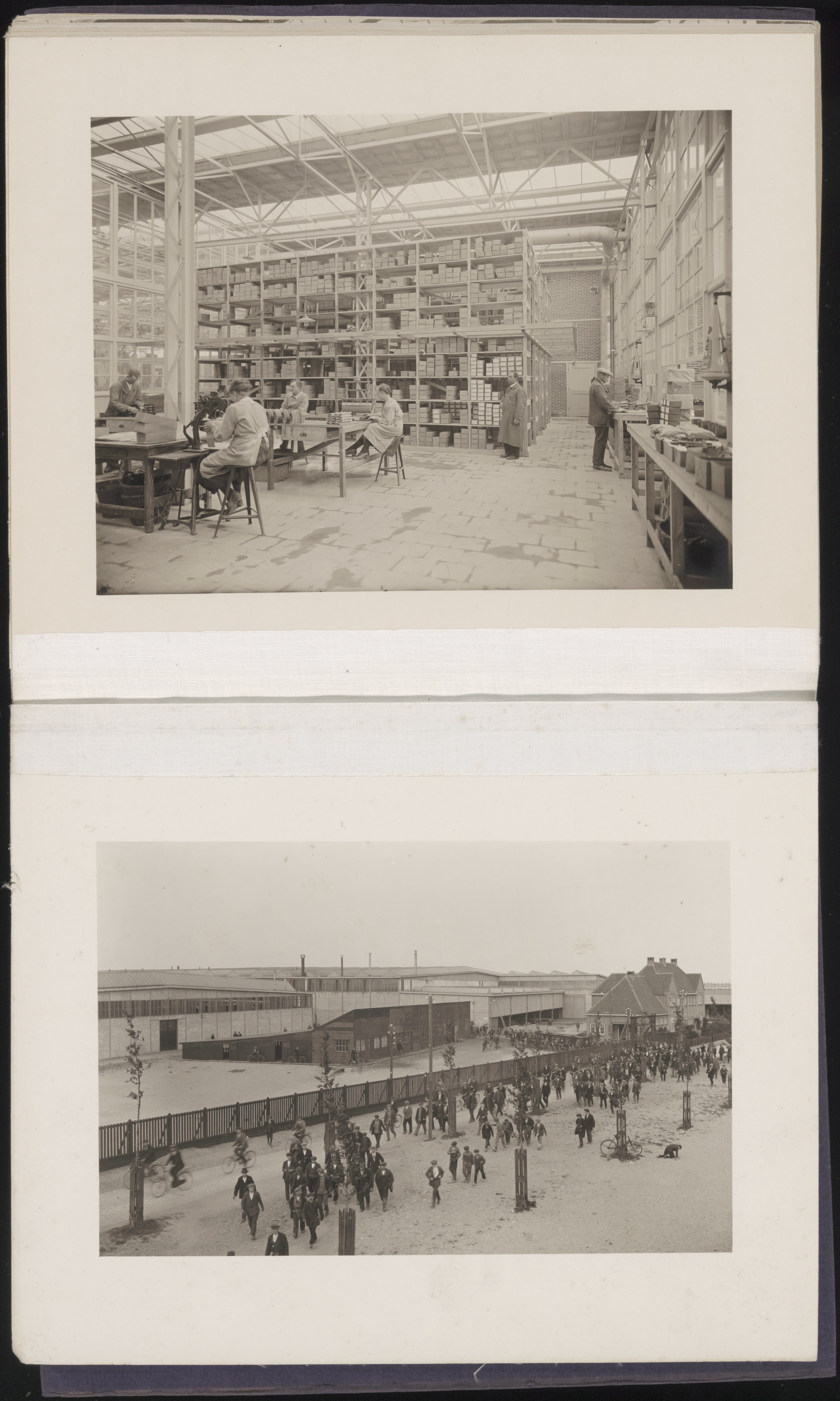 - Boven: Magazijn van de Lips sloten- en brandkastenfabriek aan de Merwedestraat. Onder: Einde arbeidstijd voor het personeel.