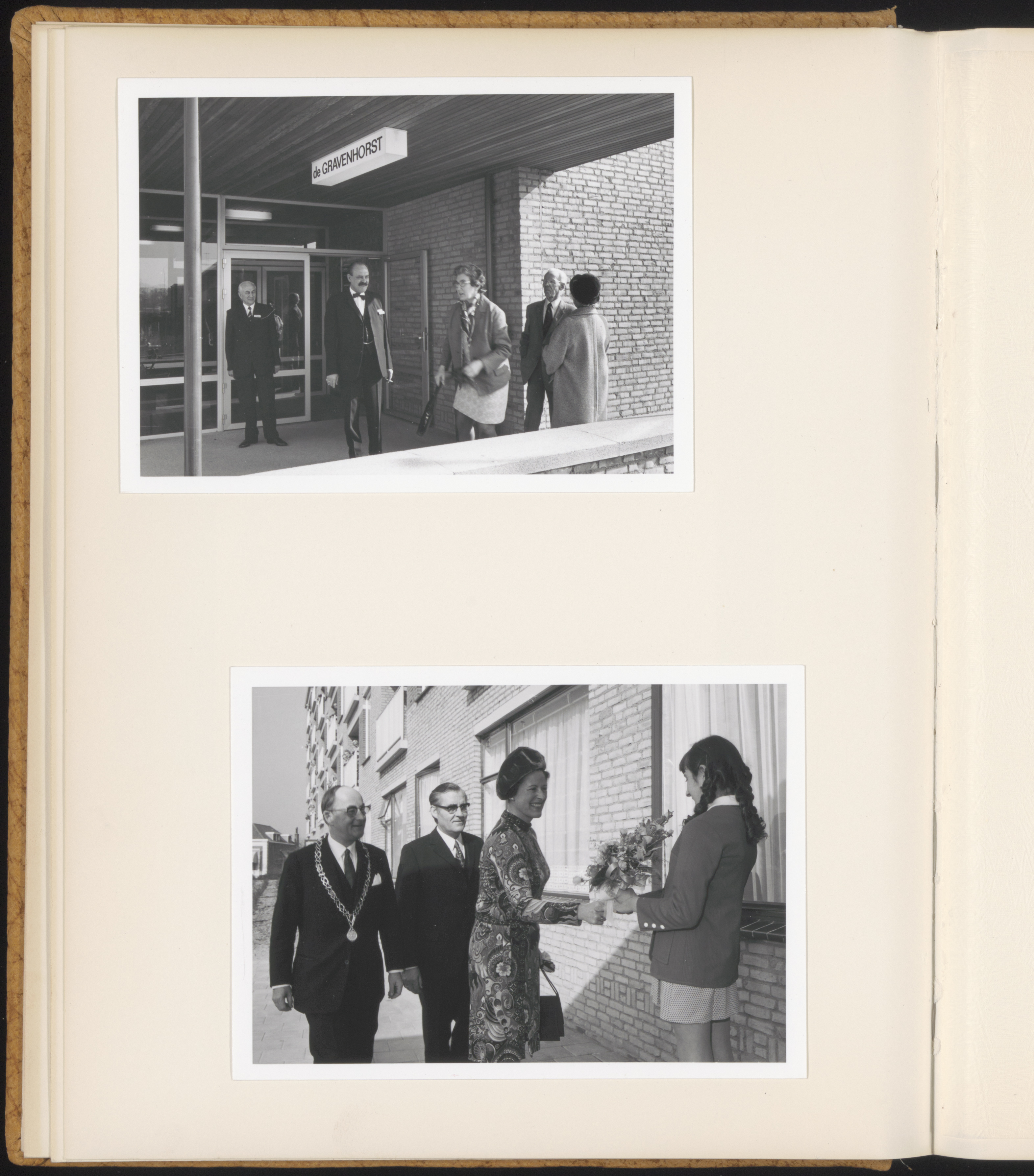 - Burgemeester Van der Lee en zijn vrouw komen aan voor de opening van bejaardencentrum De Gravenhorst aan de Vijverlaan.