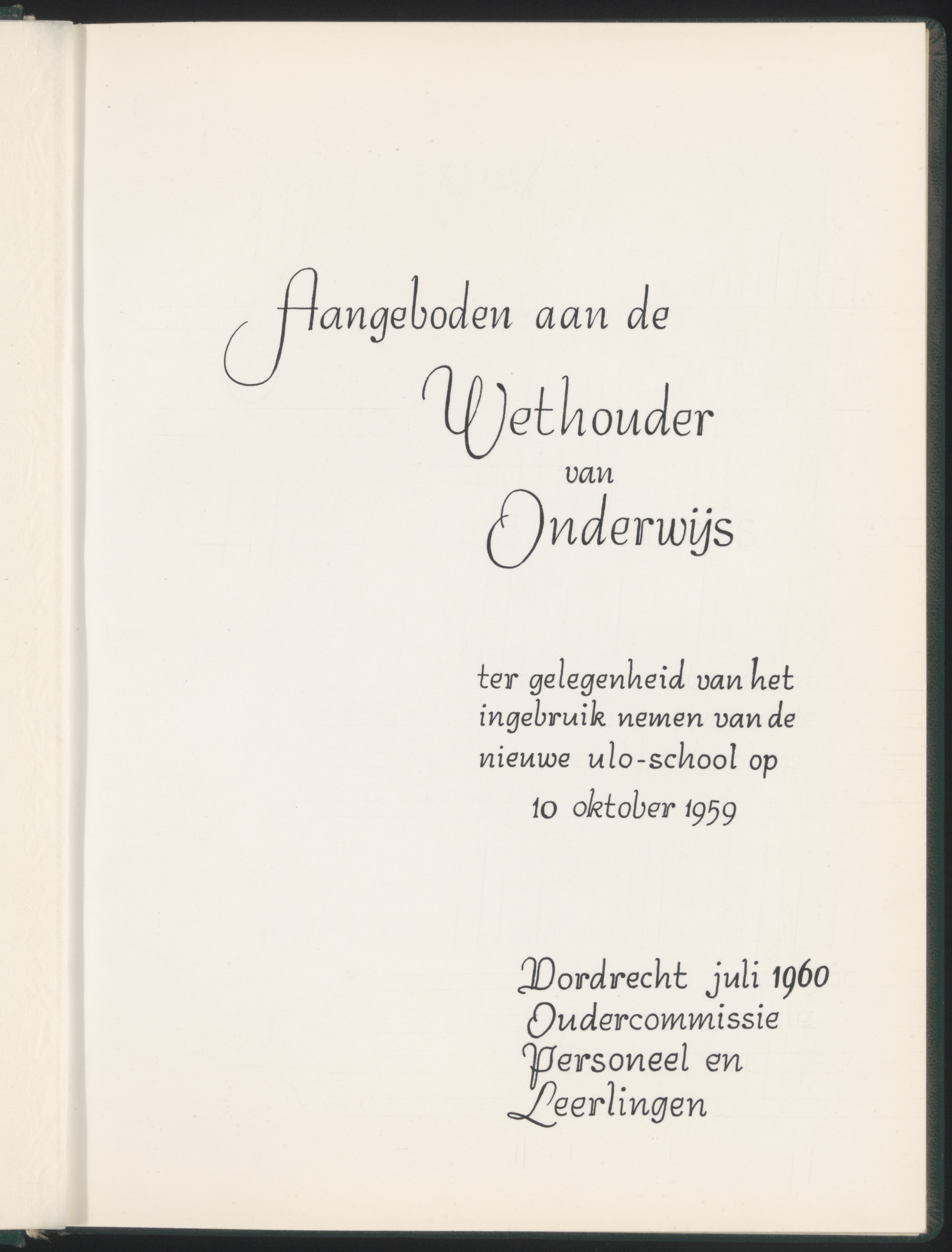 - Titelblad van album met foto's van de nieuw in gebruik genomen Mulo Krispijn aan de Patersweg.