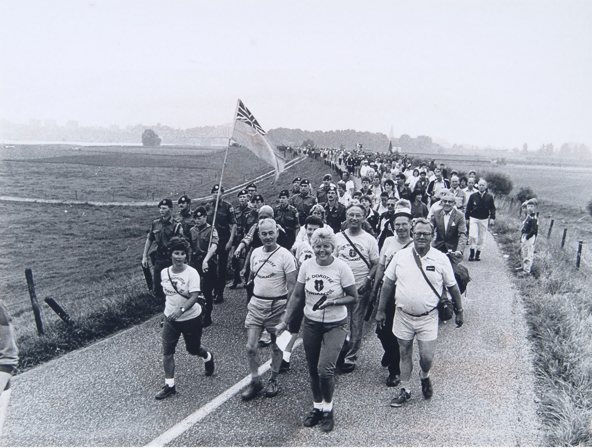Dordtse deelnemers aan de wandeltocht de Vierdaagse van Nijmegen; op de achtergrond de …
