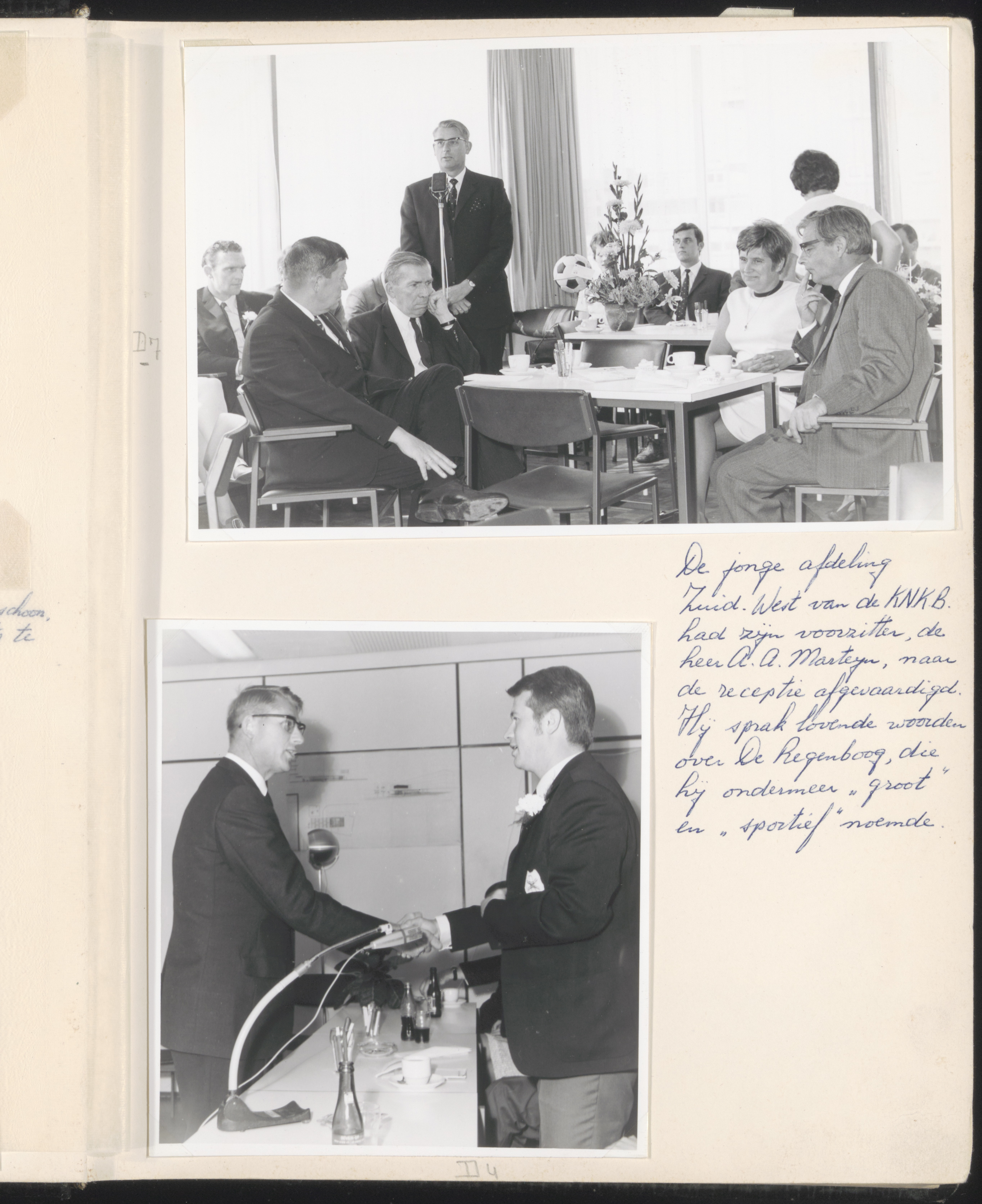 - Voorzitter A.A. Marteyn van de afdeling Zuid-West van de KNKB spreekt op de receptie t.g.v. het 40-jarig bestaan van korfbalvereniging De Regenboog in activiteitencentrum Crabbehof en schudt voorzitter Scheepbouwer de hand.