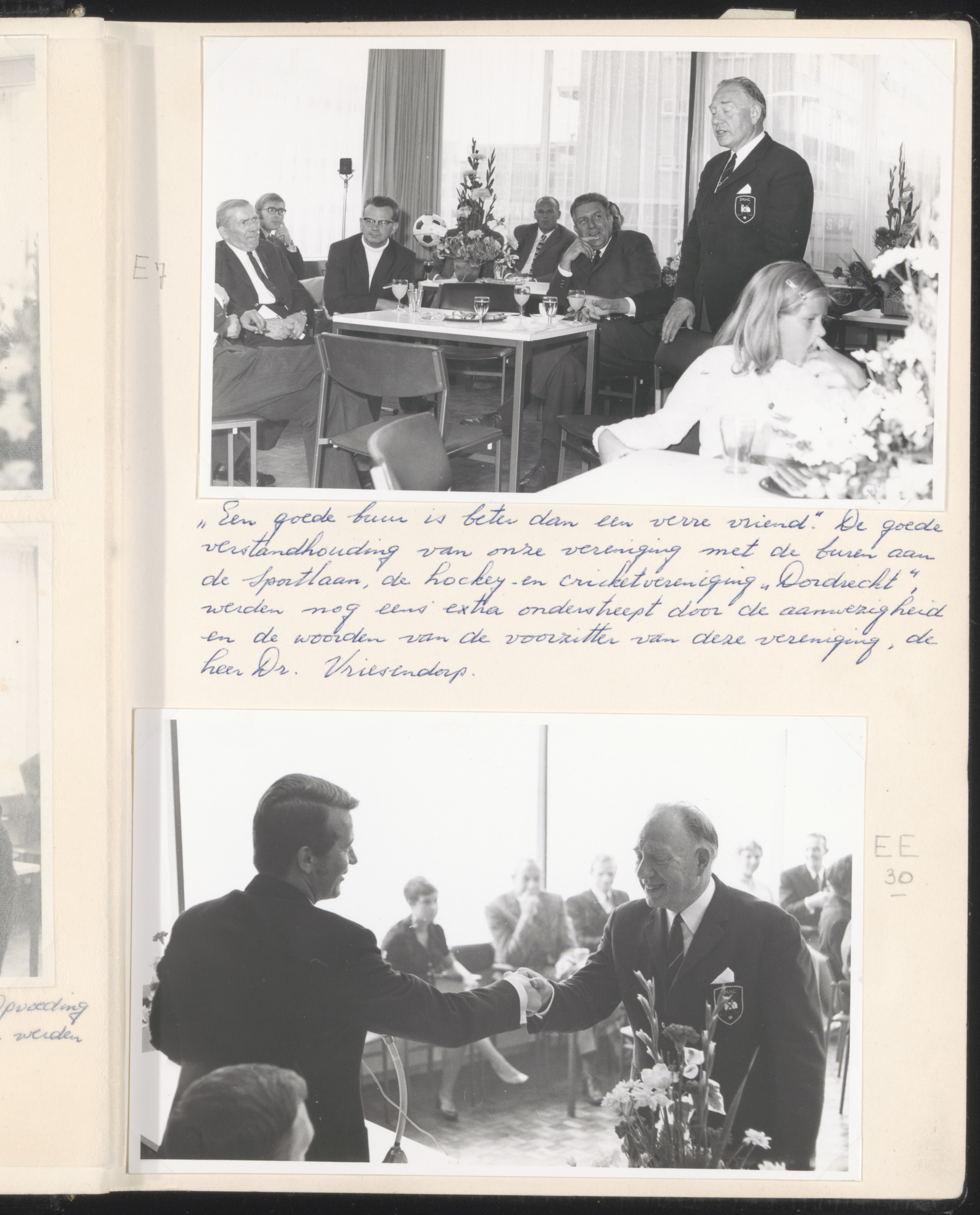 - Dr. Vriesendorp, voorzitter van de hockey- en cricketvereniging op de receptie t.g.v. het 40-jarig bestaan van korfbalvereniging De Regenboog in activiteitencentrum Crabbehof en schudt voorzitter Scheepbouwer de hand.