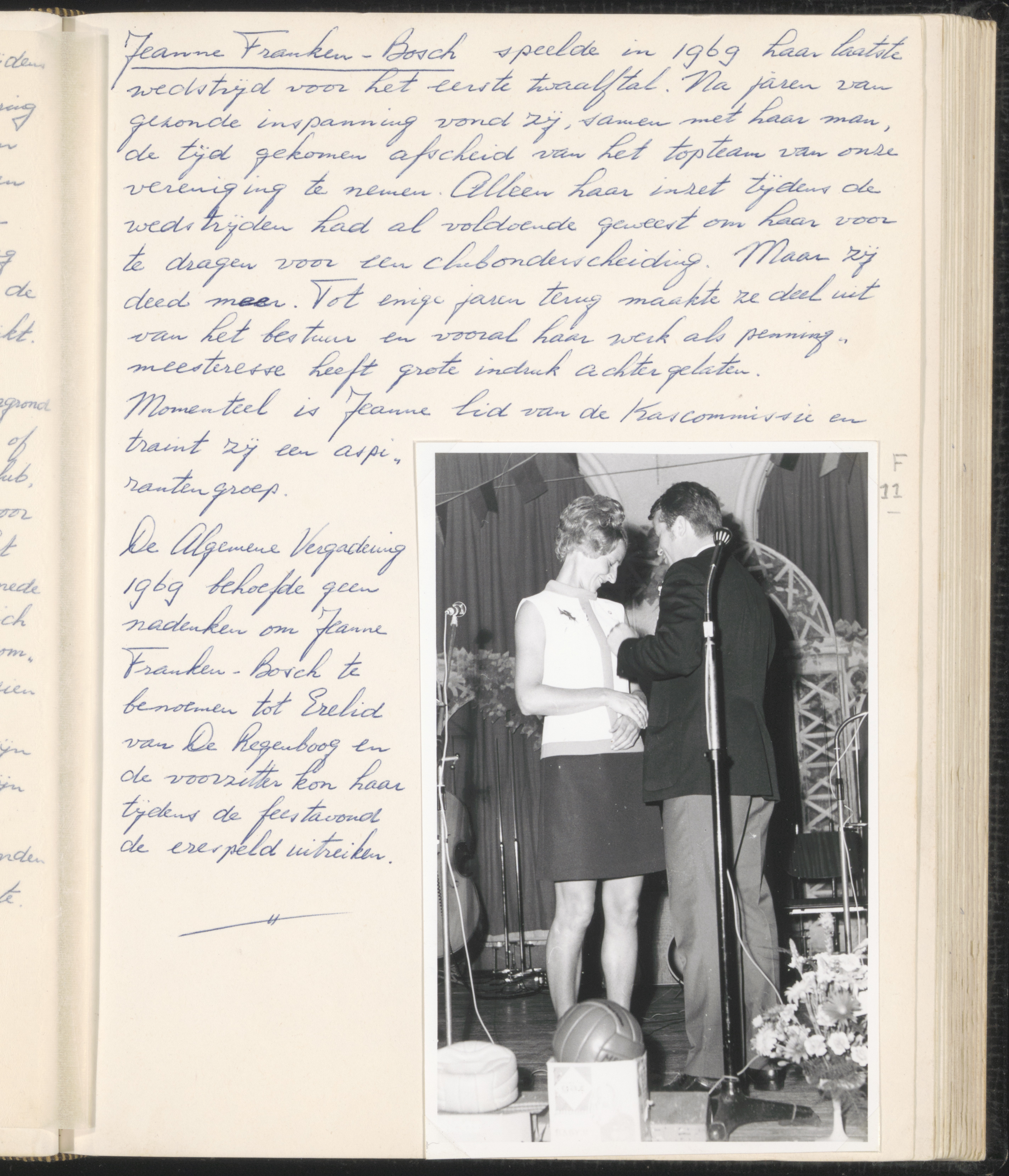 - Op de slotavond van de viering van het 40-jarig bestaan van korfbalvereniging De Regenboog in de kleine zaal van schouwburg Kunstmin, speldt voorzitter Scheepbouwer bij Jeanne Franken de versierselen op behorende bij het erelidmaatschap.
