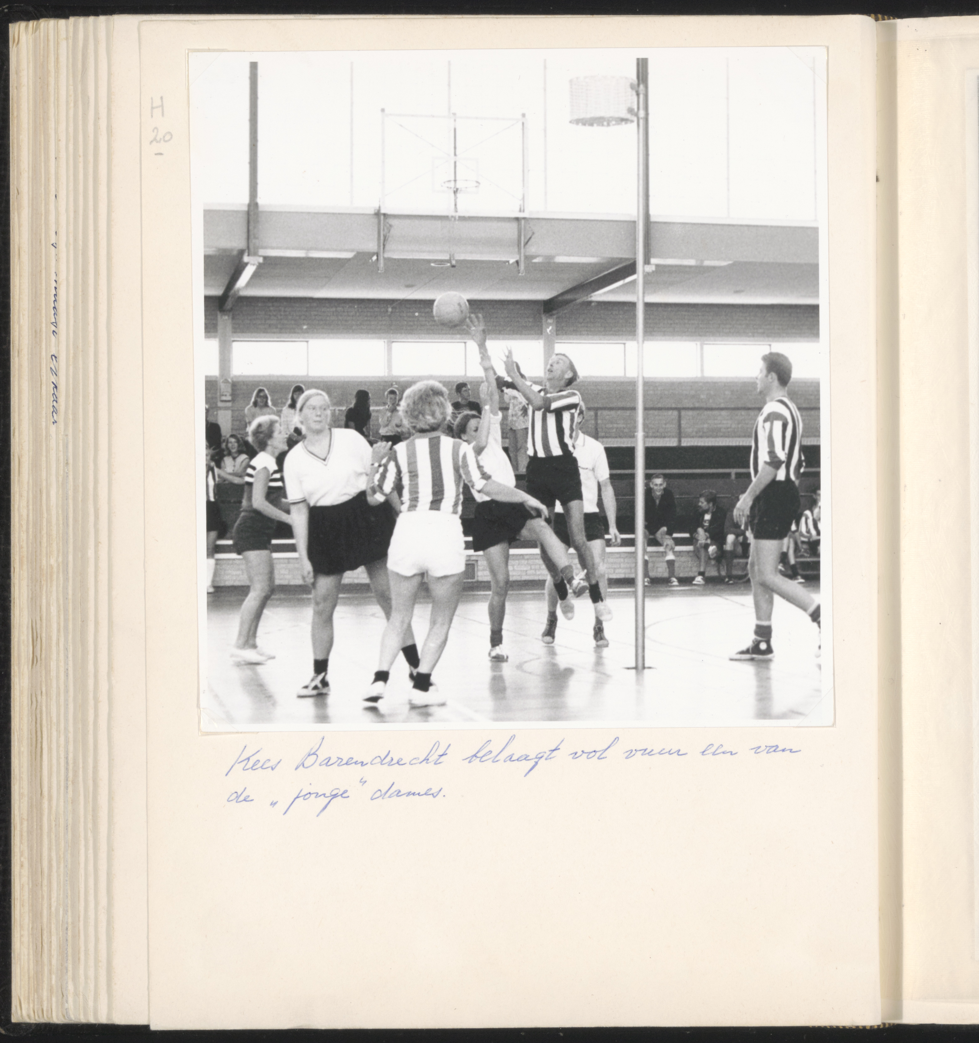 - Korfbalwedstrijd op de slotdag van de viering van het 40-jarig bestaan van korfbalvereniging De Regenboog in Sporthal Wielwijk. De opspringende speler is Kees Barendrecht.