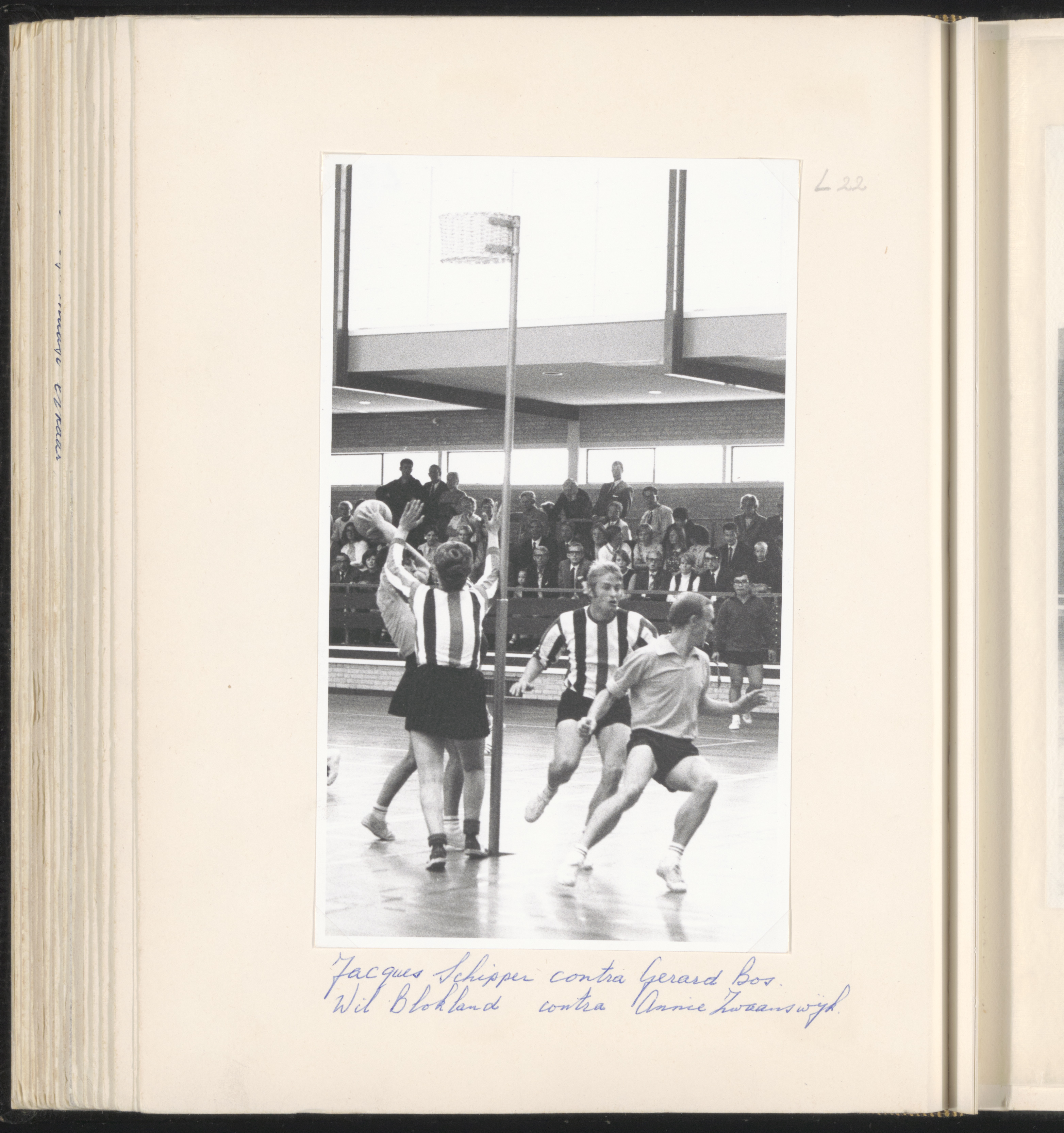 Jacques Schipper, Gerard Bos, Wil Blokland en Annie Zwaanswijk in een korfbalwedstrijd …