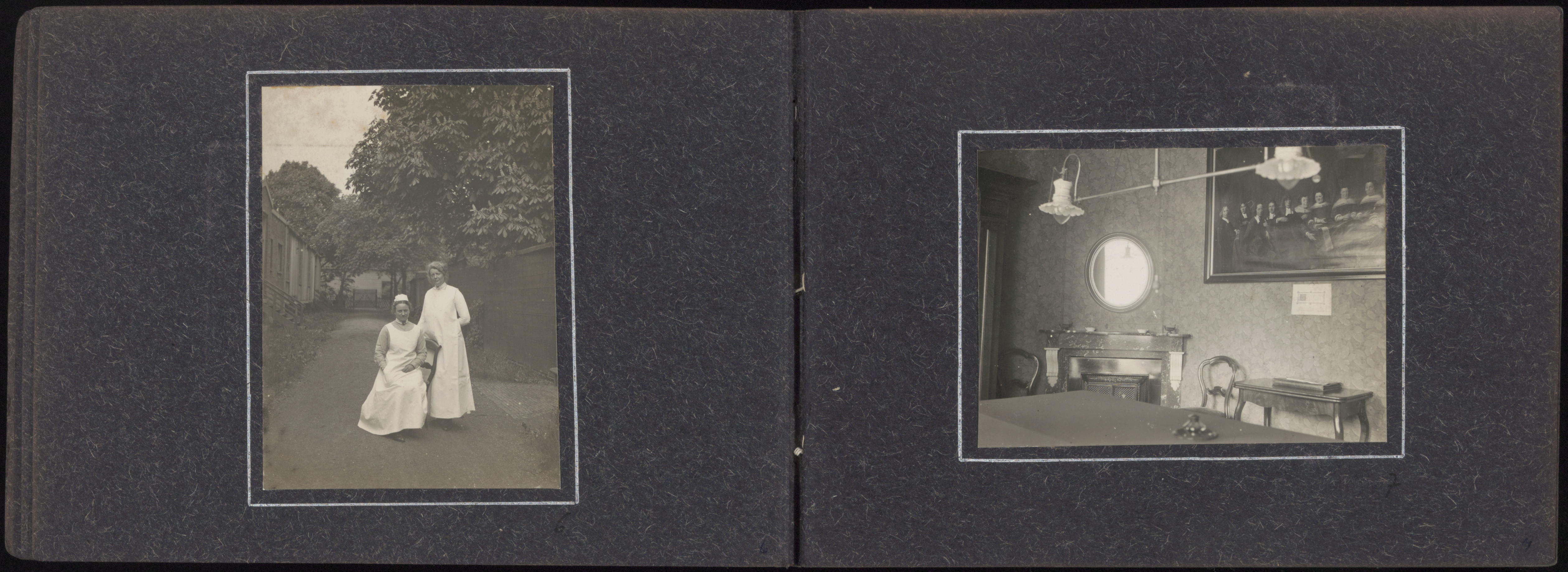 - Links: Verpleegsters aan de achterzijde van het Gasthuis of Ziekenhuis op het Beverwijcksplein. Rechts: Interieur.