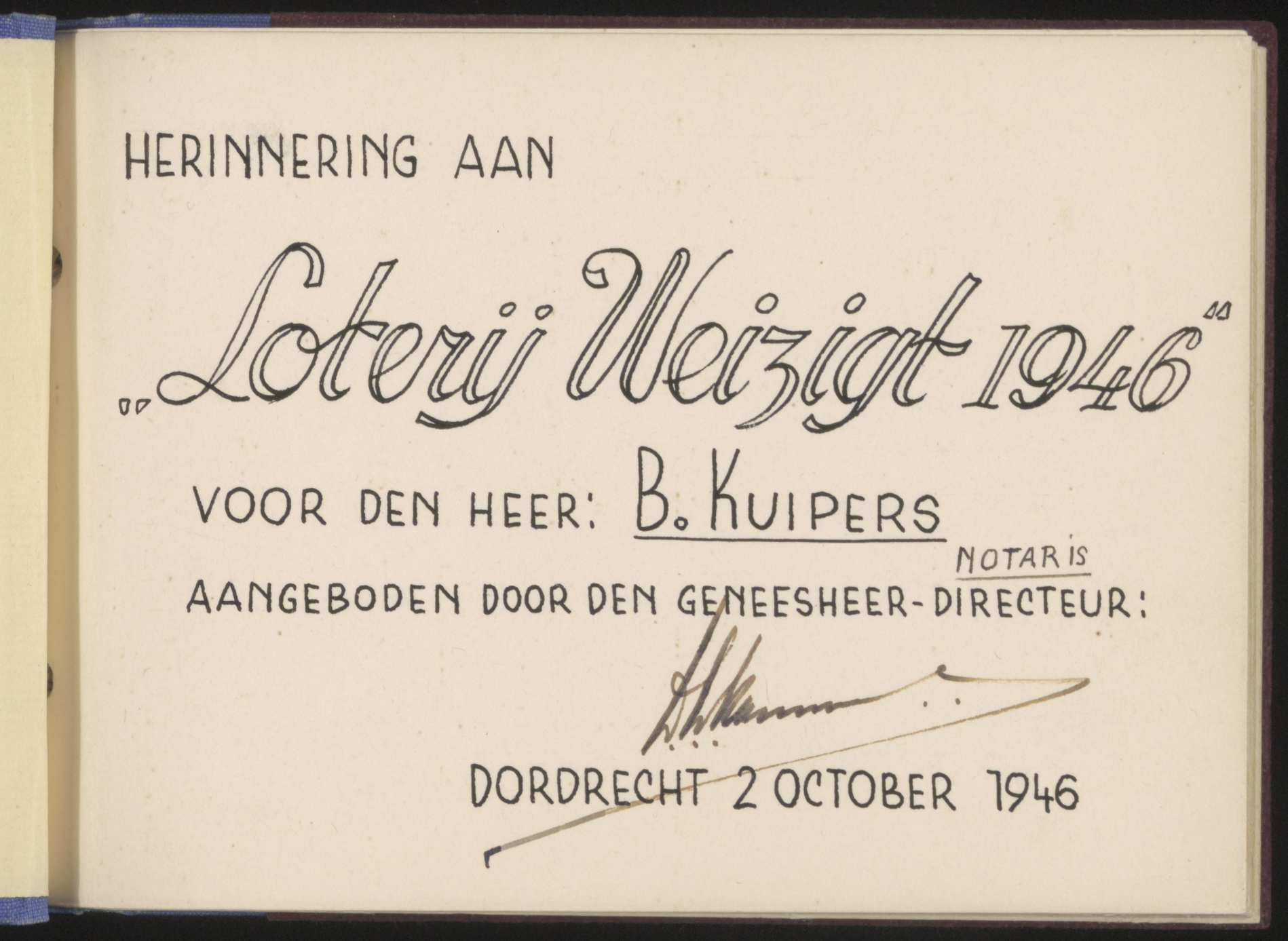 - Titelblad van het album voor B. Kuipers, notaris van de loterij t.b.v. sanatorium Weizigt.