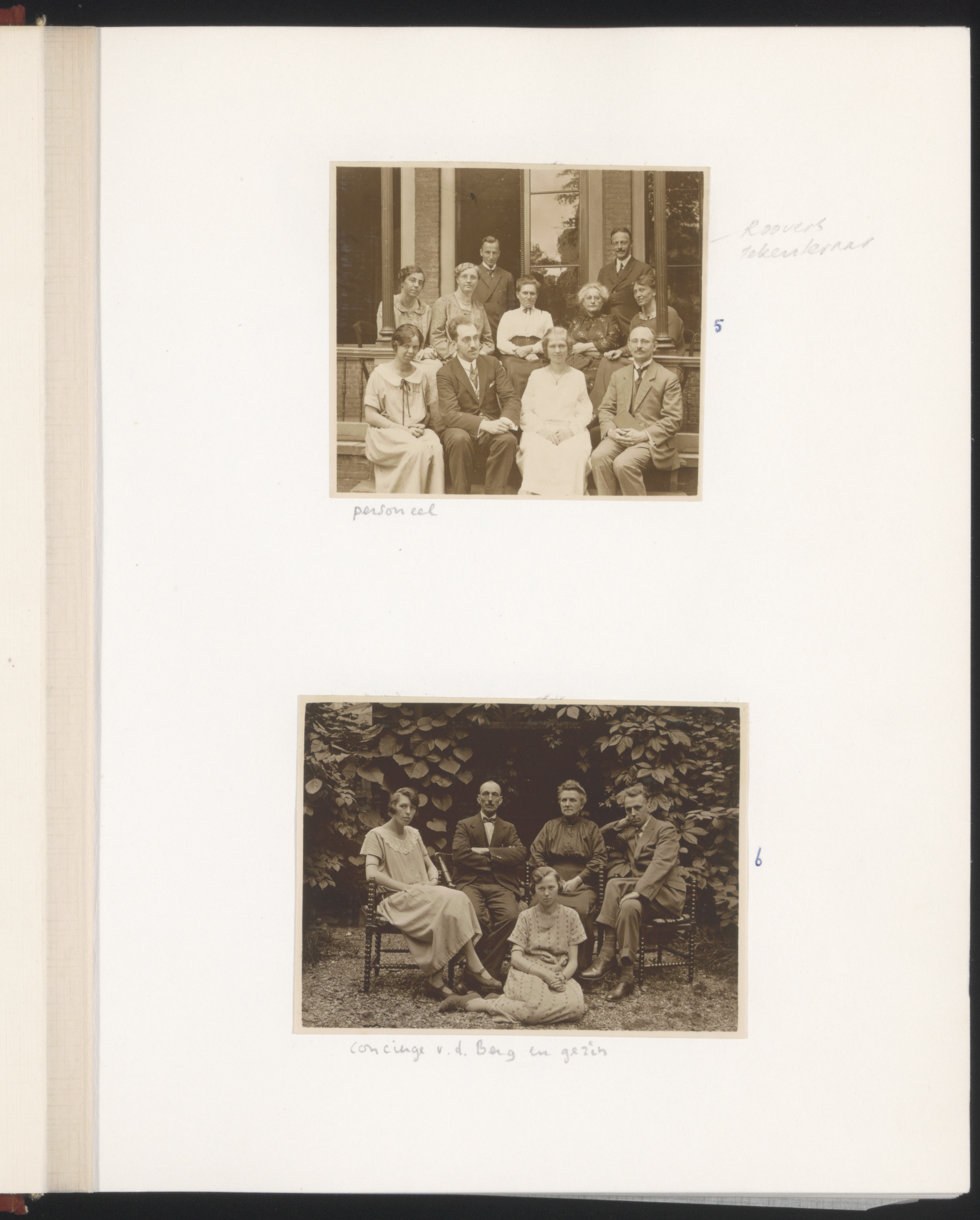 - Boven: Docenten van de Middelbare Meisjesschool aan het Steegoversloot. Onder: Conciërge Van de Berg en zijn gezin.