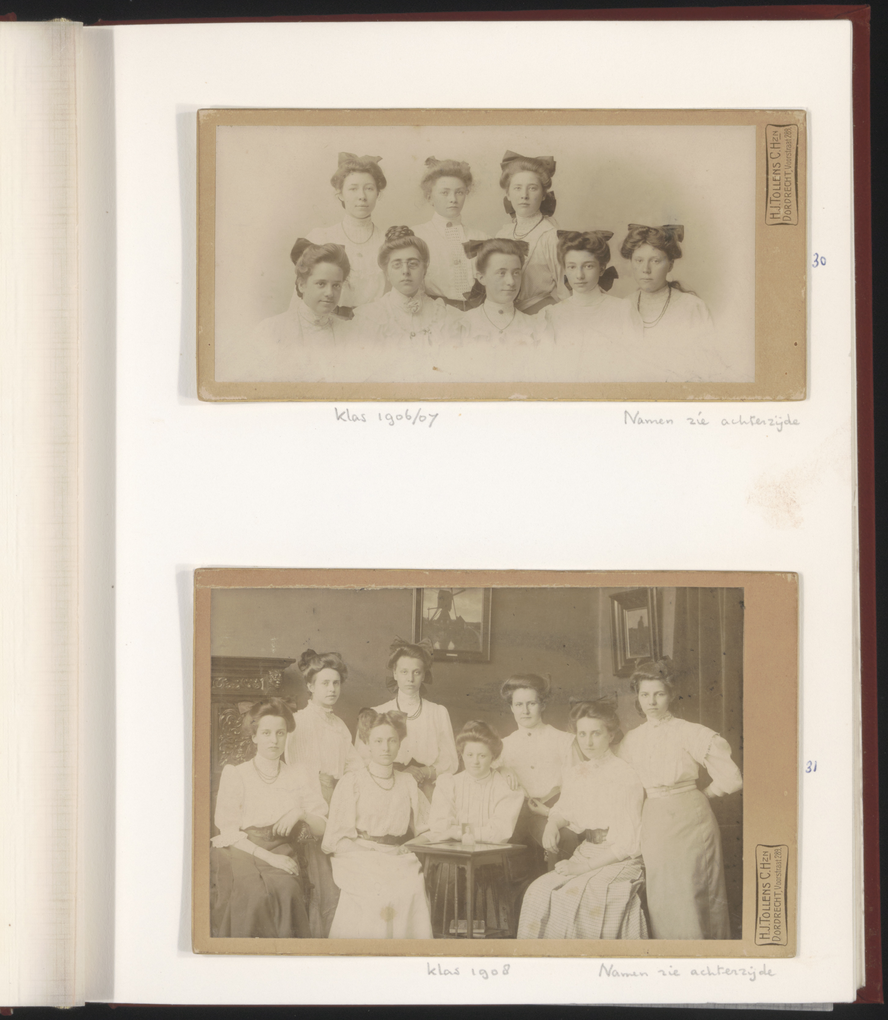 - Een klas van de Middelbare Meisjesschool in het Steegoversloot in het leerjaar 1906-1907 en in het leerjaar 1908.