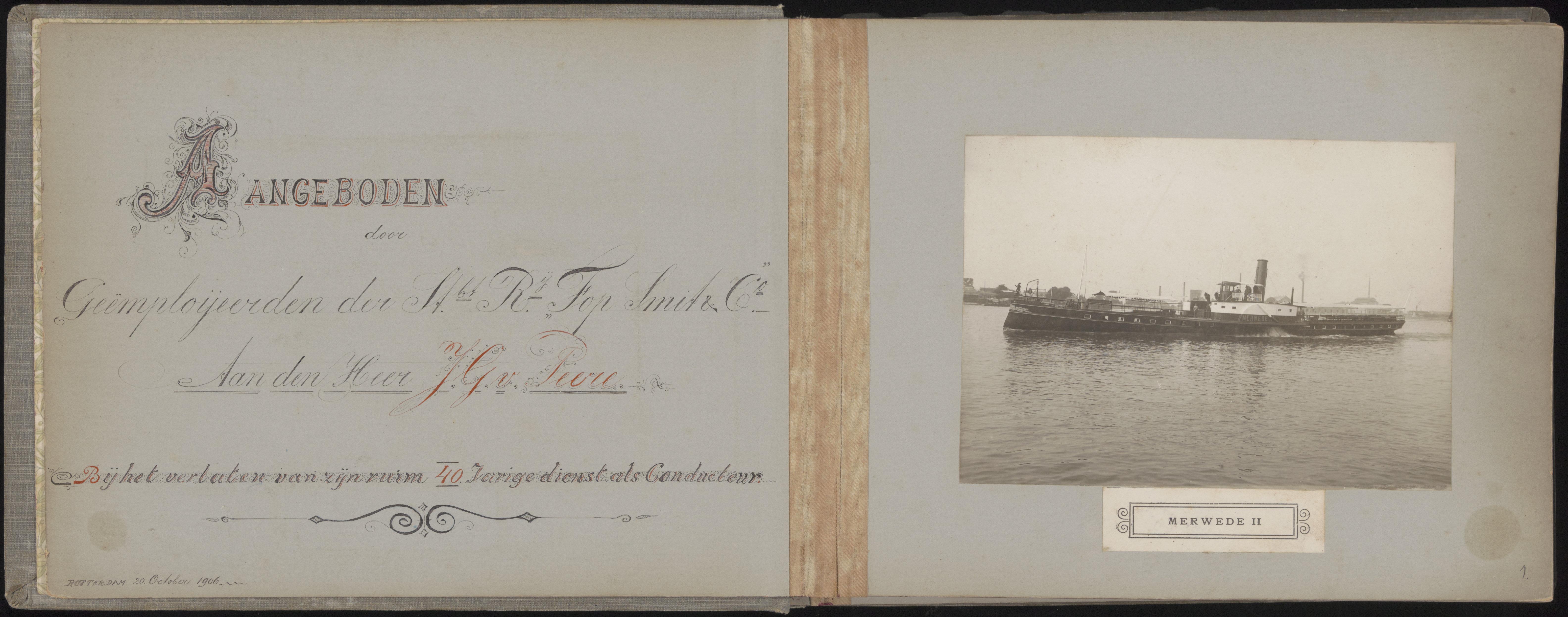 - Links: Titelblad van album voor de heer J.G. van Peere bij het verlaten van zijn ruim 40-jarige dienst als conducteur bij Stoomboot-reederij Fop Smit & co., Rotterdam - Dordrecht - Gorinchem, aangeboden door het personeel. Rechts: Stoomraderboot Merwede II van rederij Fop Smit.