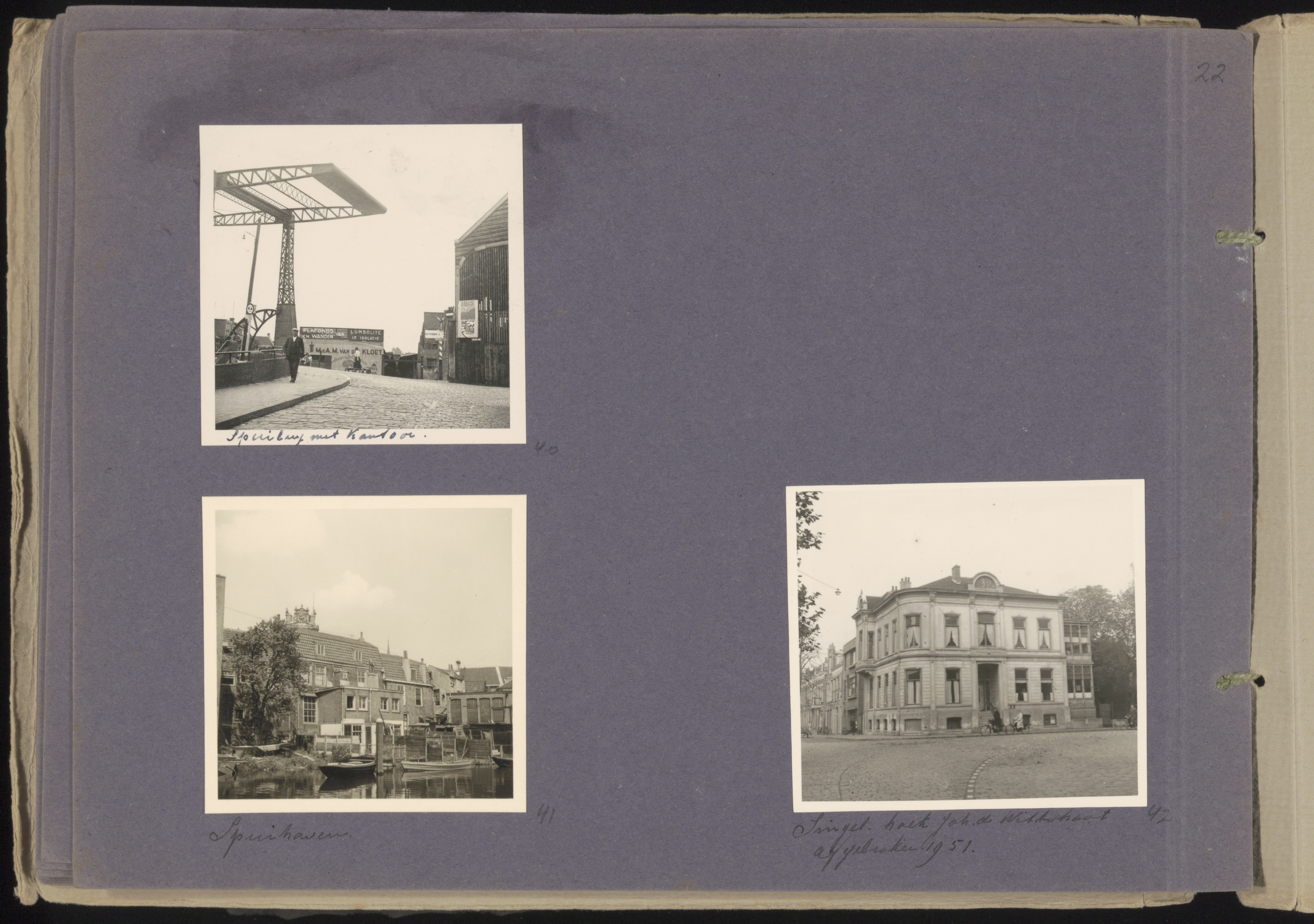 - Boven: Zuidersluisbrug vanaf het Achterhakkers. Rechts pakhuizen aan de Sluisweg. Linksonder: Spuihaven vanaf terrein houthandel v.d. Kloet met achterkant van de huizen aan het Slikveld. Rechtsonder: Hoek Albert Cuypsingel - Johan de Wittstraat (rechts).