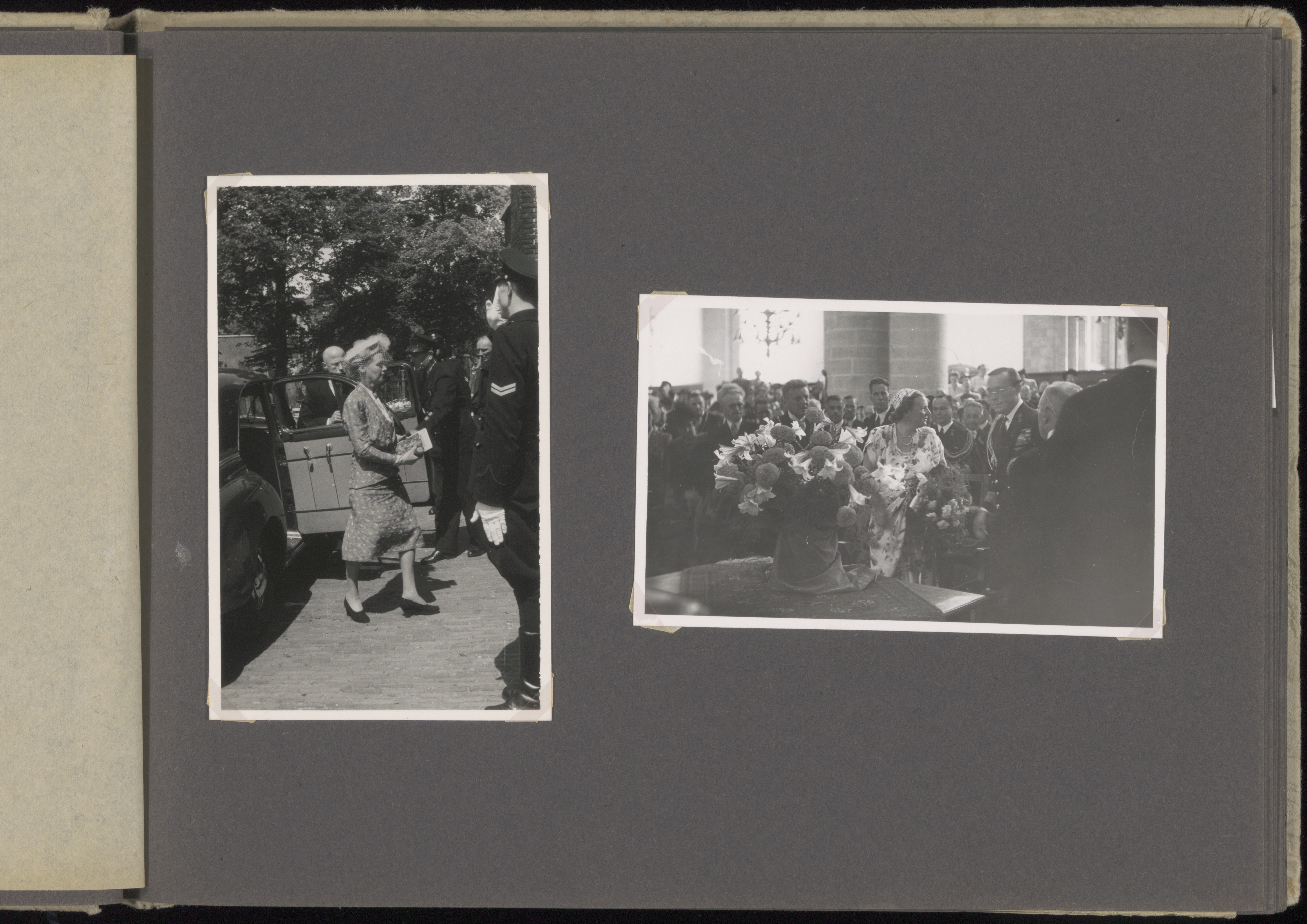 Rechts: Prinses Juliana, prins Bernhard en burgemeester Bleeker te midden van …