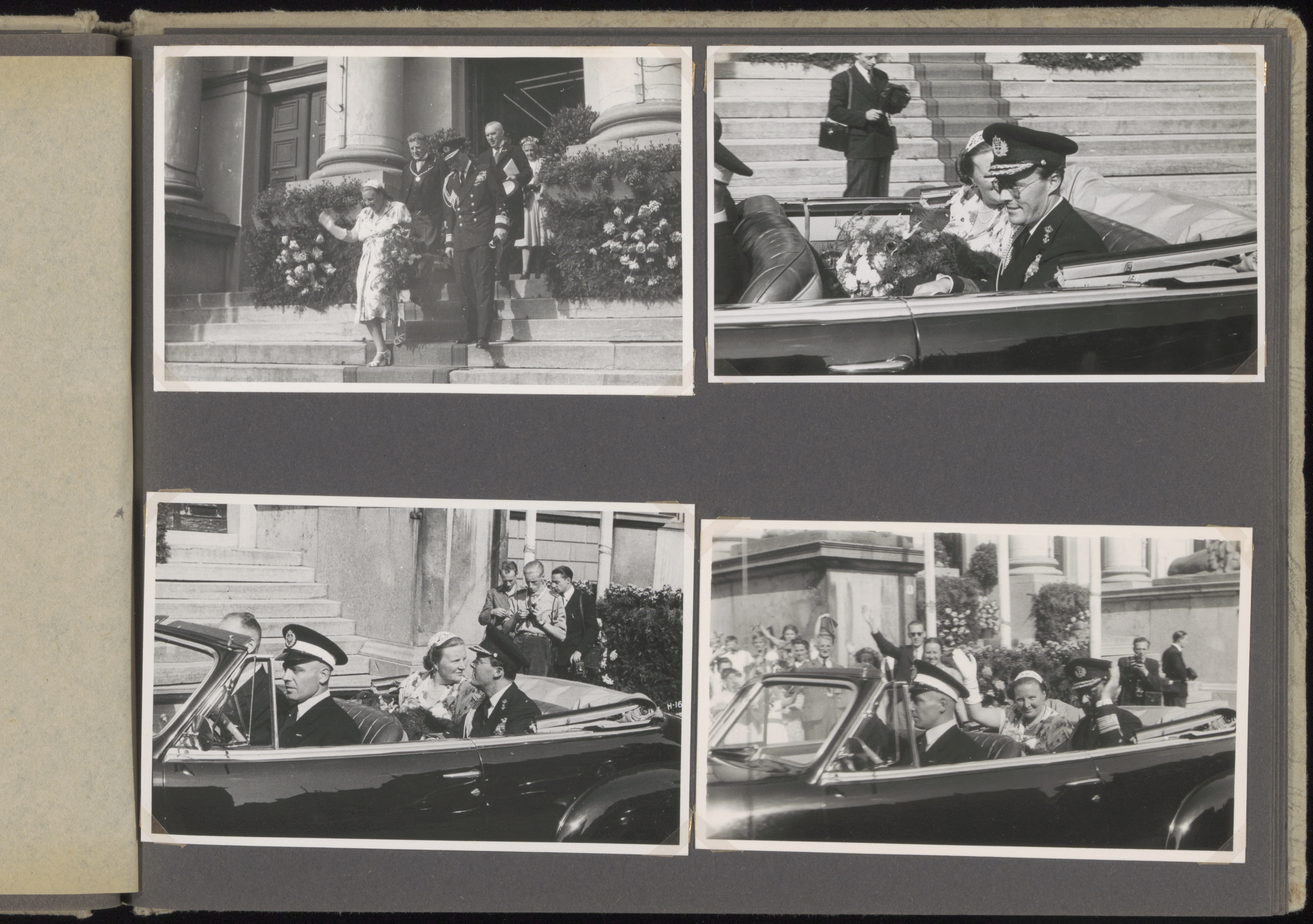 - Prinses Juliana, prins Bernhard en burgemeester Bleeker bij het stadhuis tijdens de viering van de Hoffeesten t.g.v. de 375e herdenking van de Eerste Vrije Statenverkiezing in 1572.