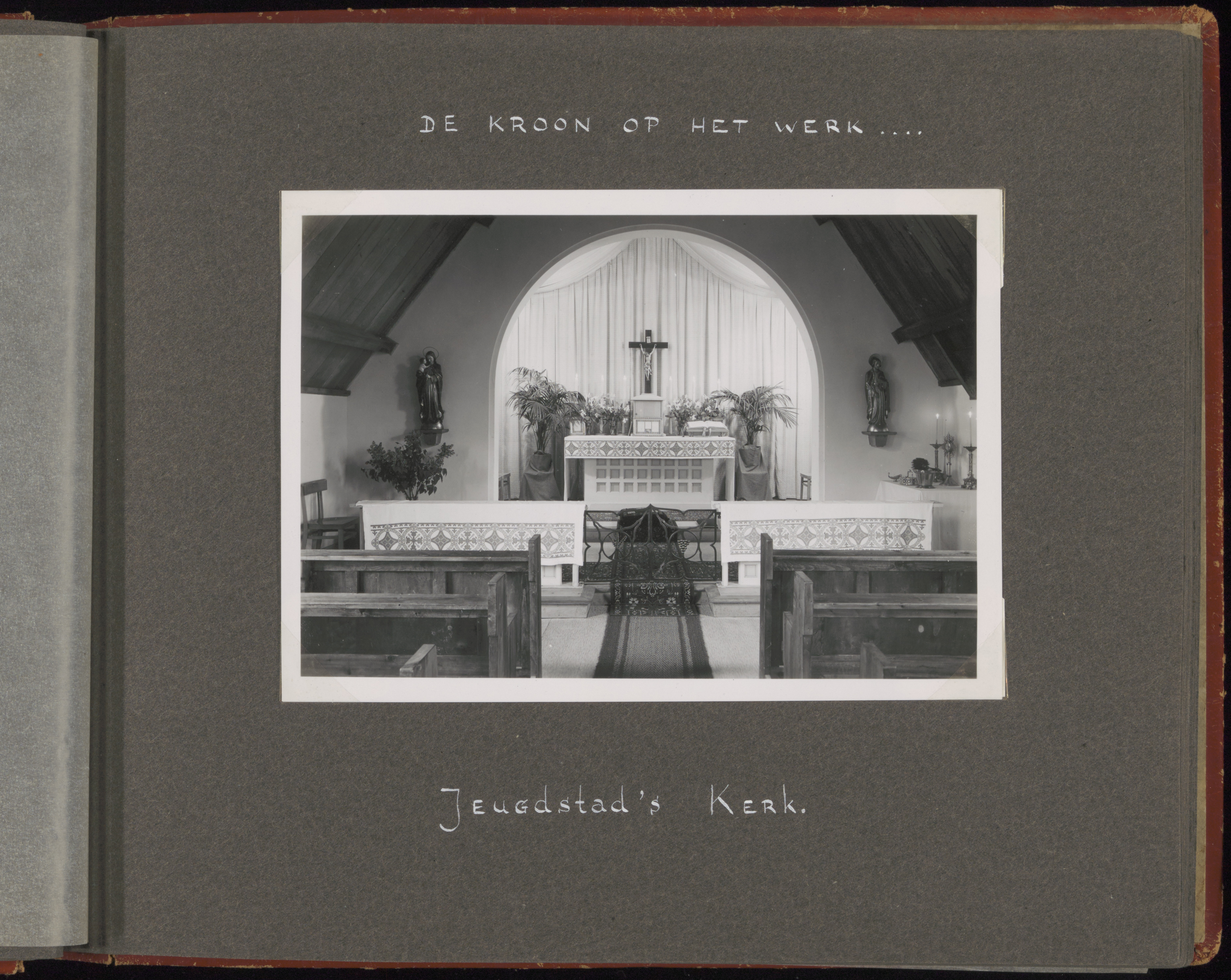 Als kerk ingerichte ruimte van de RK jeugdorganisatie Jeugdstad in de Wijnstraat.