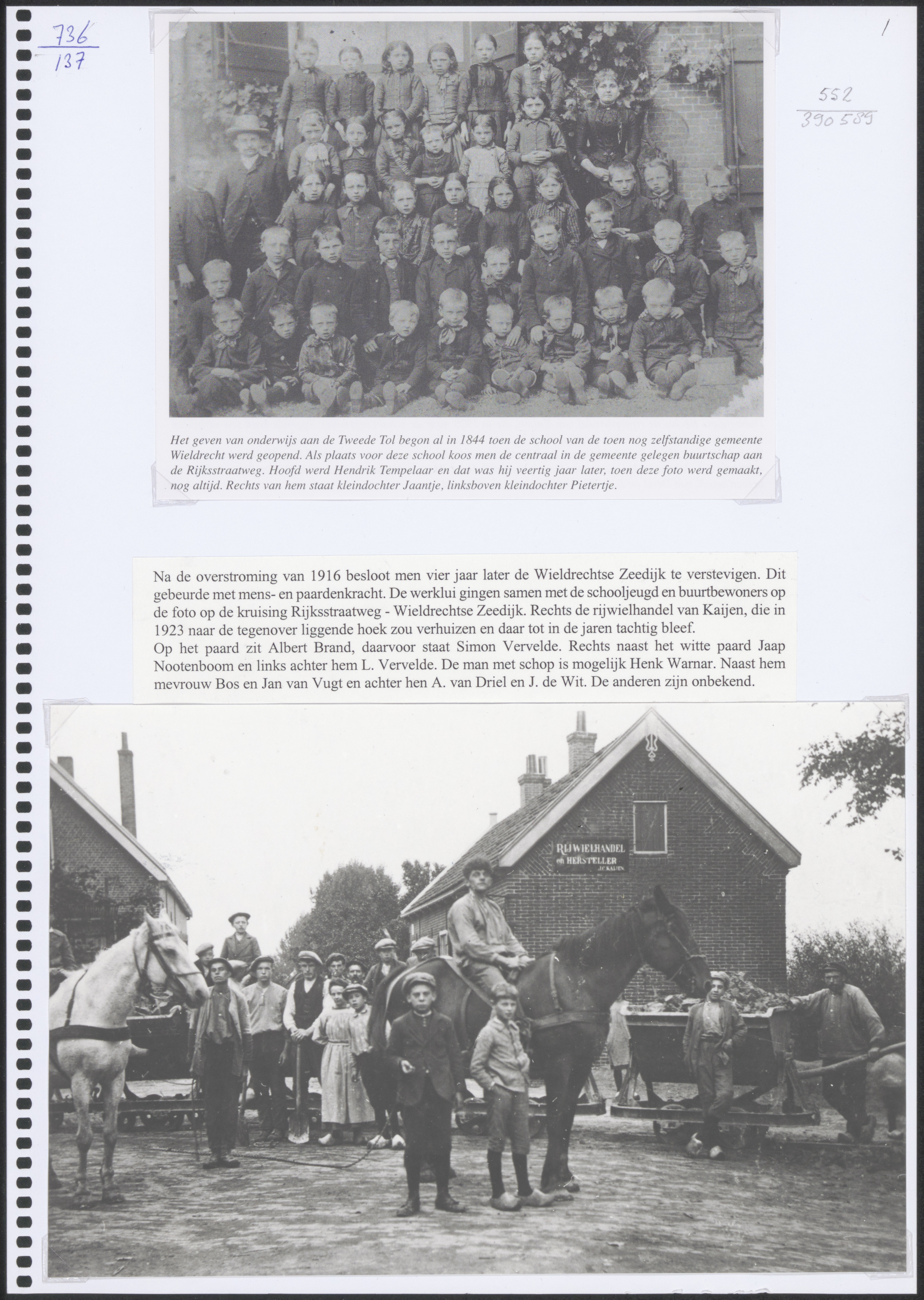 - Boven: Klassenfoto met hoofdonderwijzer Hendrik Tempelaar van de school aan de Tweede Tol in Wieldrecht. Onder: Leerlingen van de school aan de Tweede Tol omringen de arbeiders van de dijkversteviging op de kruising Rijksstraatweg / Wieldrechtse Zeedijk.