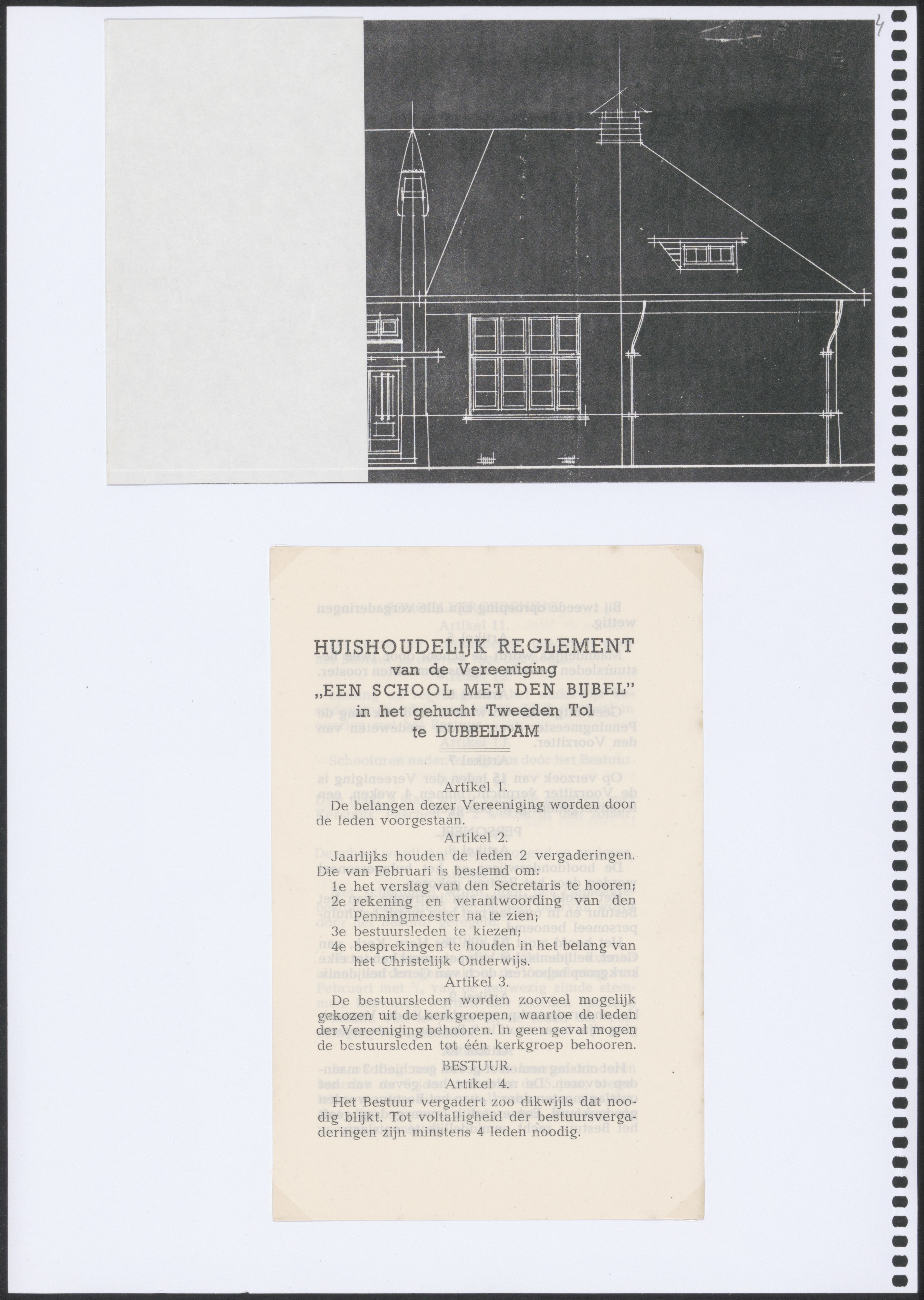 - Boven: Bouwtekening van de christerlijke school aan de Rijksstraatweg. Onder: Bladzijde van het huishoudelijk reglement van deze school.