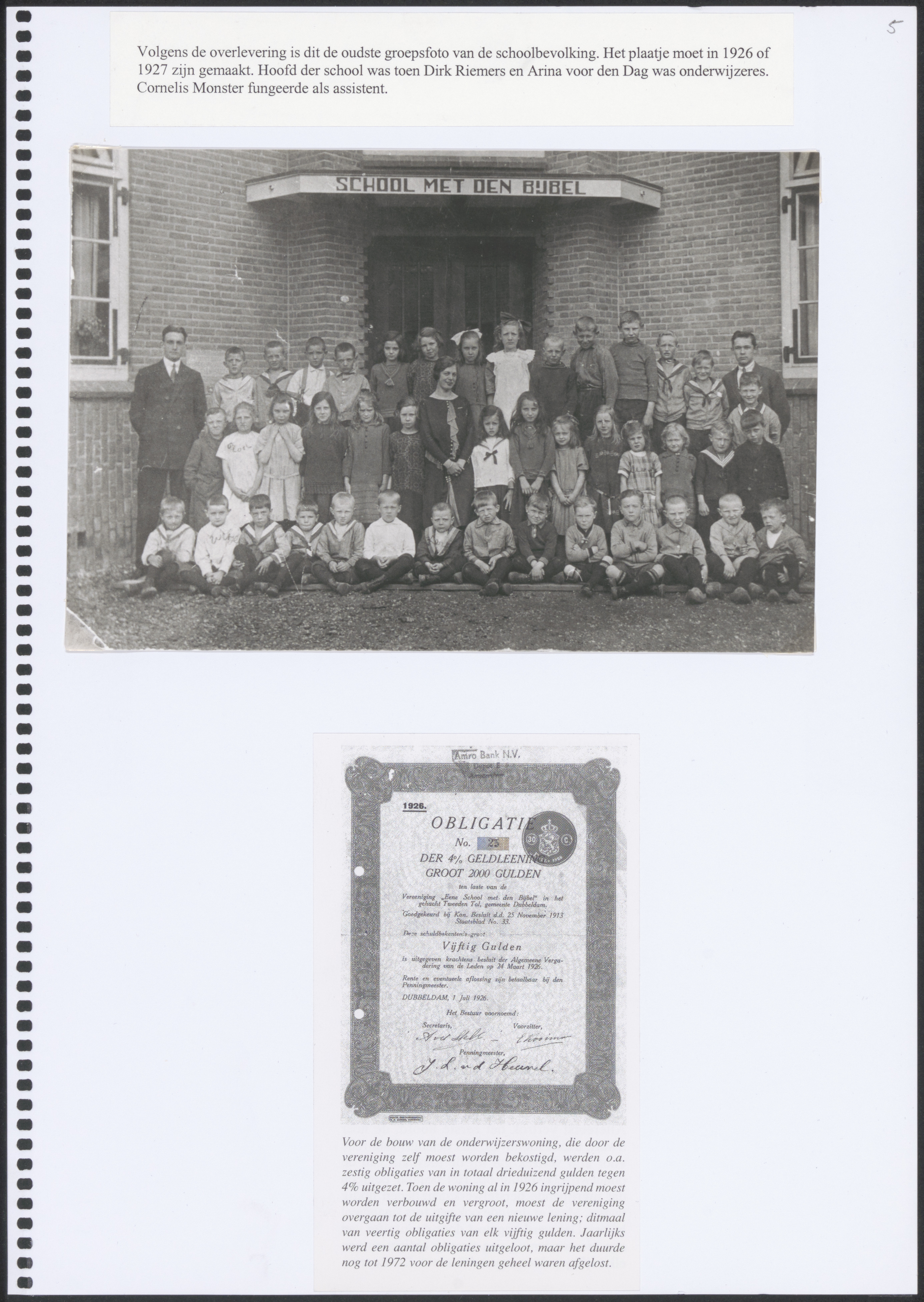 - Boven: Volgens de overlevering is dit de oudste groepsfoto van de schoolbevolking van de christelijke school aan de Rijksstraatweg. Hoofd der school was toen Dirk Riemers en Arina voor den Dag was onderwijzeres. Cornelis Monster tenslotte fungeerde als assistent. Onder: Voor de bouw van de onderwijzerswoning, die door de vereniging zelf moest worden bekostigd, werden o.a. zestig obligaties van in totaal 3000 gulden tegen 4% uitgezet. Jaarlijks werden er een aantal uitgeloot, maar toch duurde het nog tot 1972 voor de leningen geheel waren afgelost.