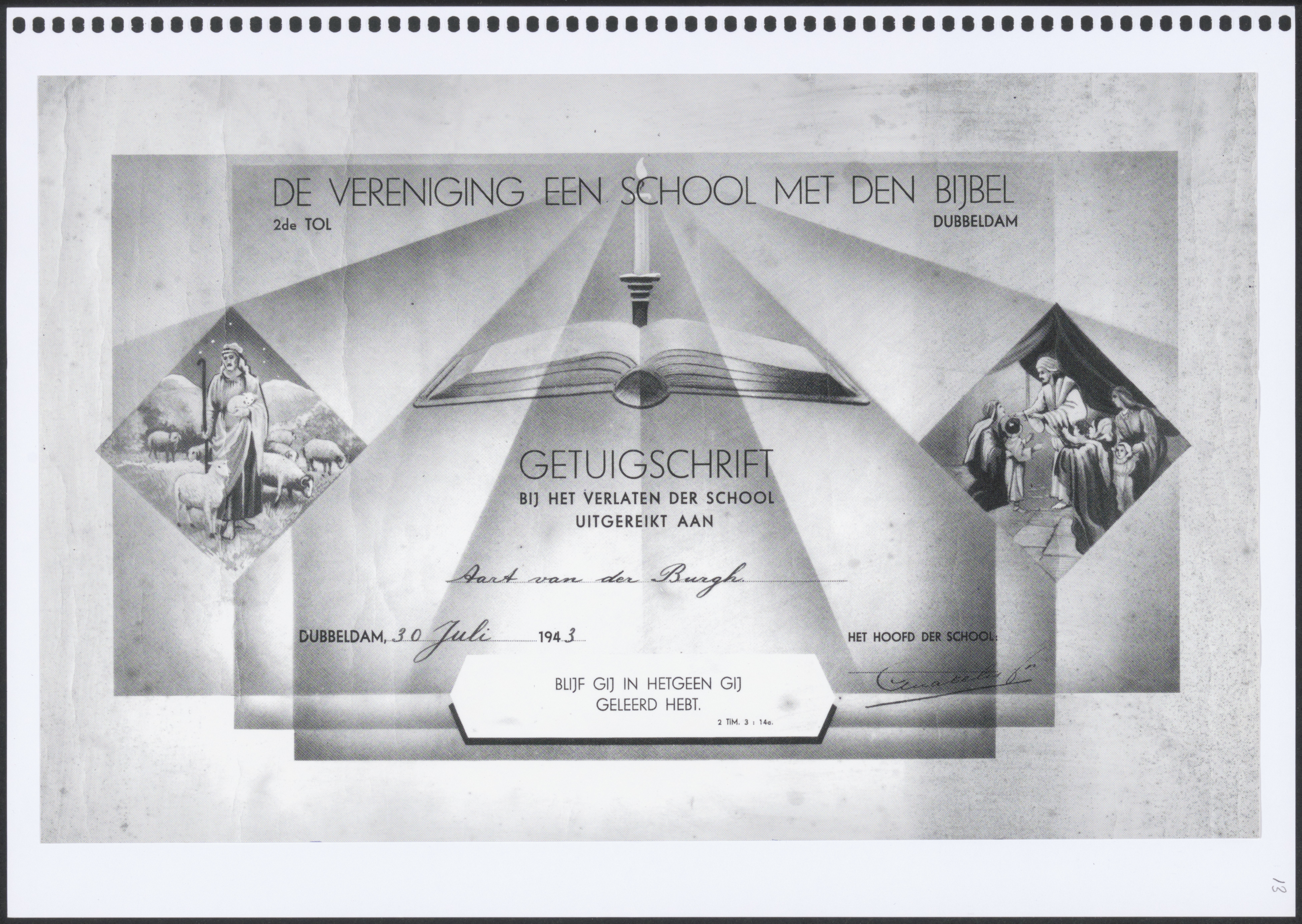 - Getuigschrift, uitgereikt aan Aart van der Burgh bij het verlaten van de christelijke school Tweede Tol aan de Rijksstraatweg.