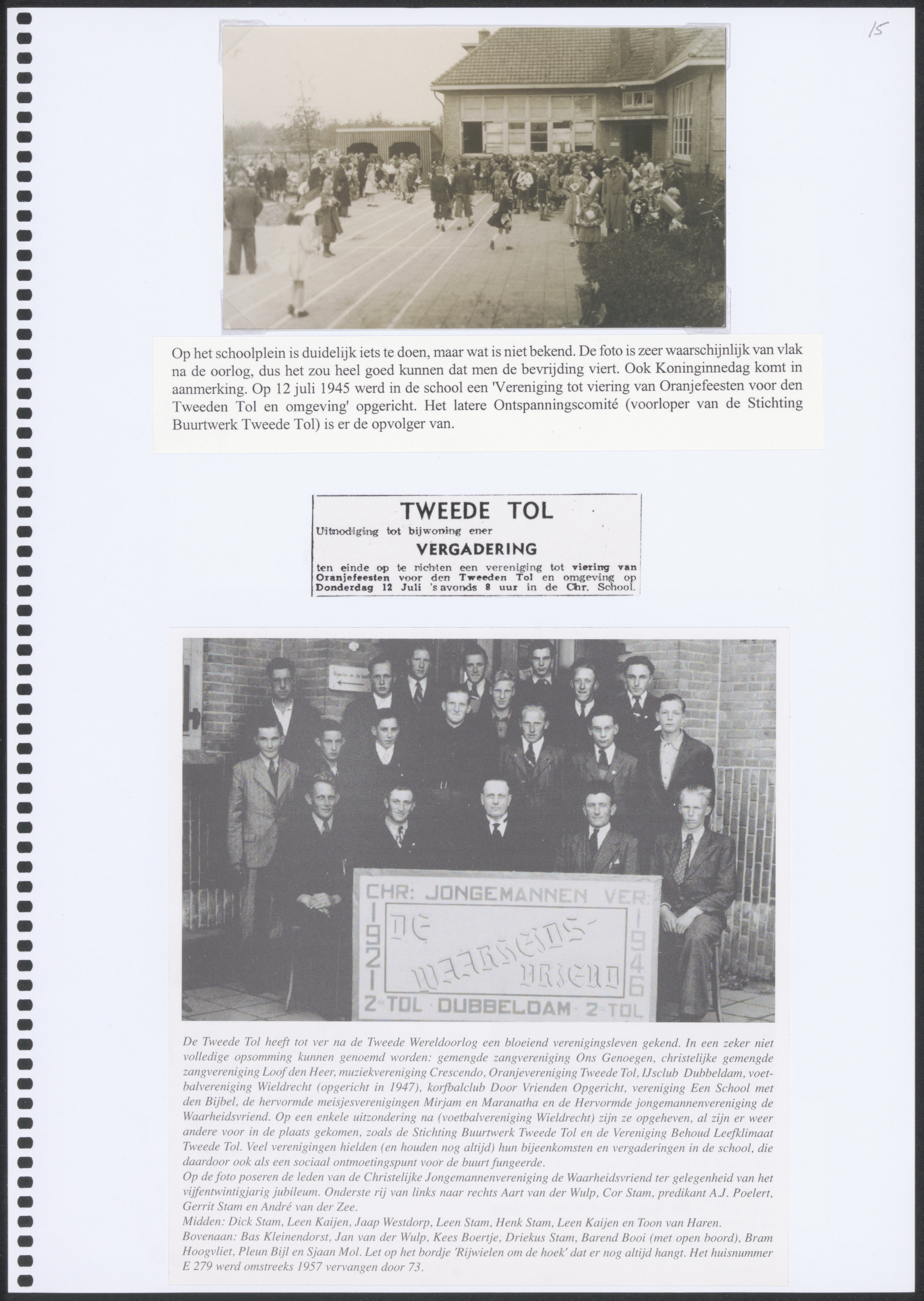 - Boven: Schoolplein en het gebouw van de christelijke school Tweede Tol aan de Rijksstraatweg. Midden: Oproep voor een vergadering door een van de vele verenigingen die hun bijeenkomsten in de school hielden. Onder: Leden van de Christelijke Jongemannenvereniging de Waarheidsvriend ter gelegenheid van het vijfentwintigjarige jubileum.