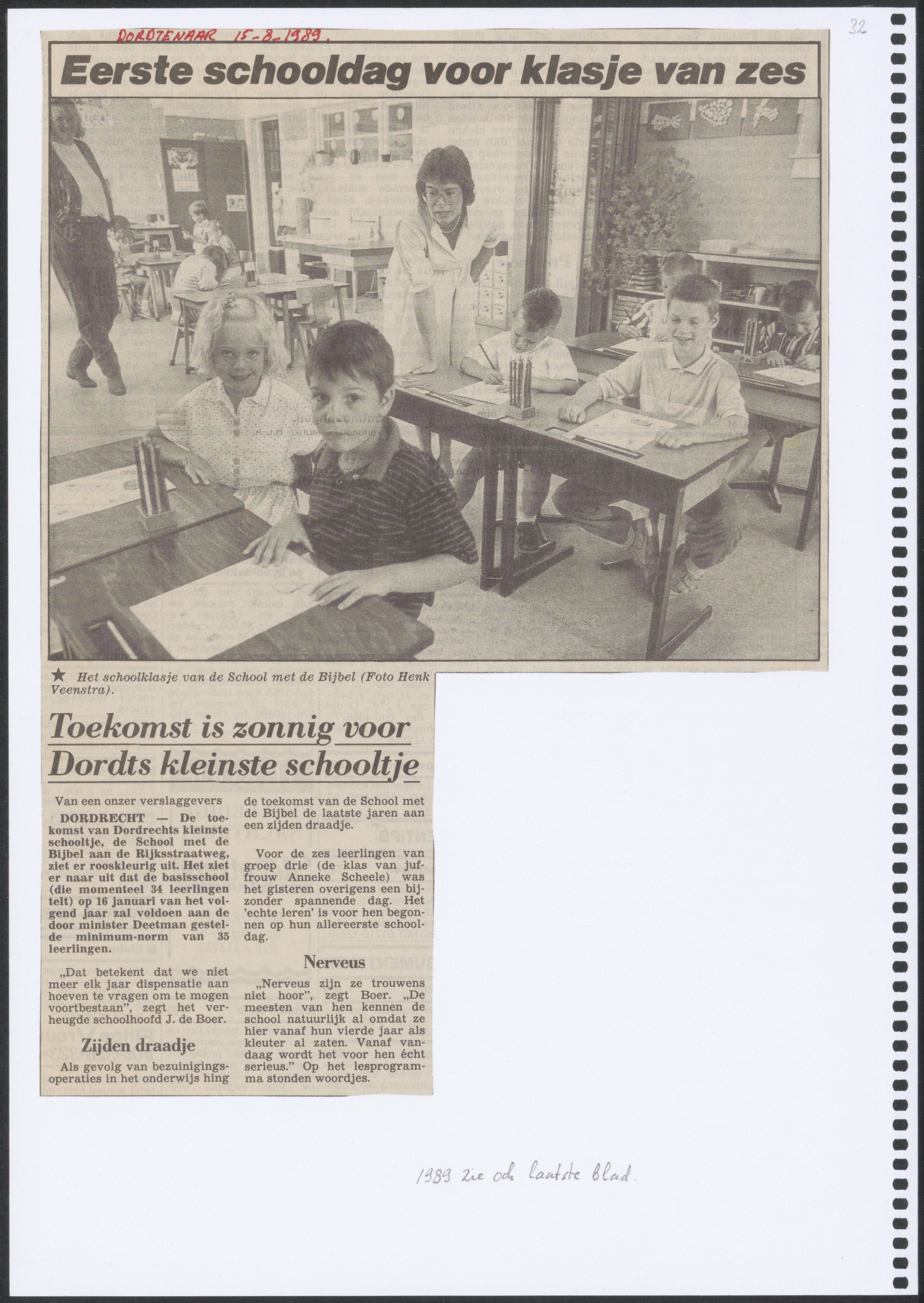 Krantenartikel over afgewende sluiting van de christelijke school Tweede Tol aan de …