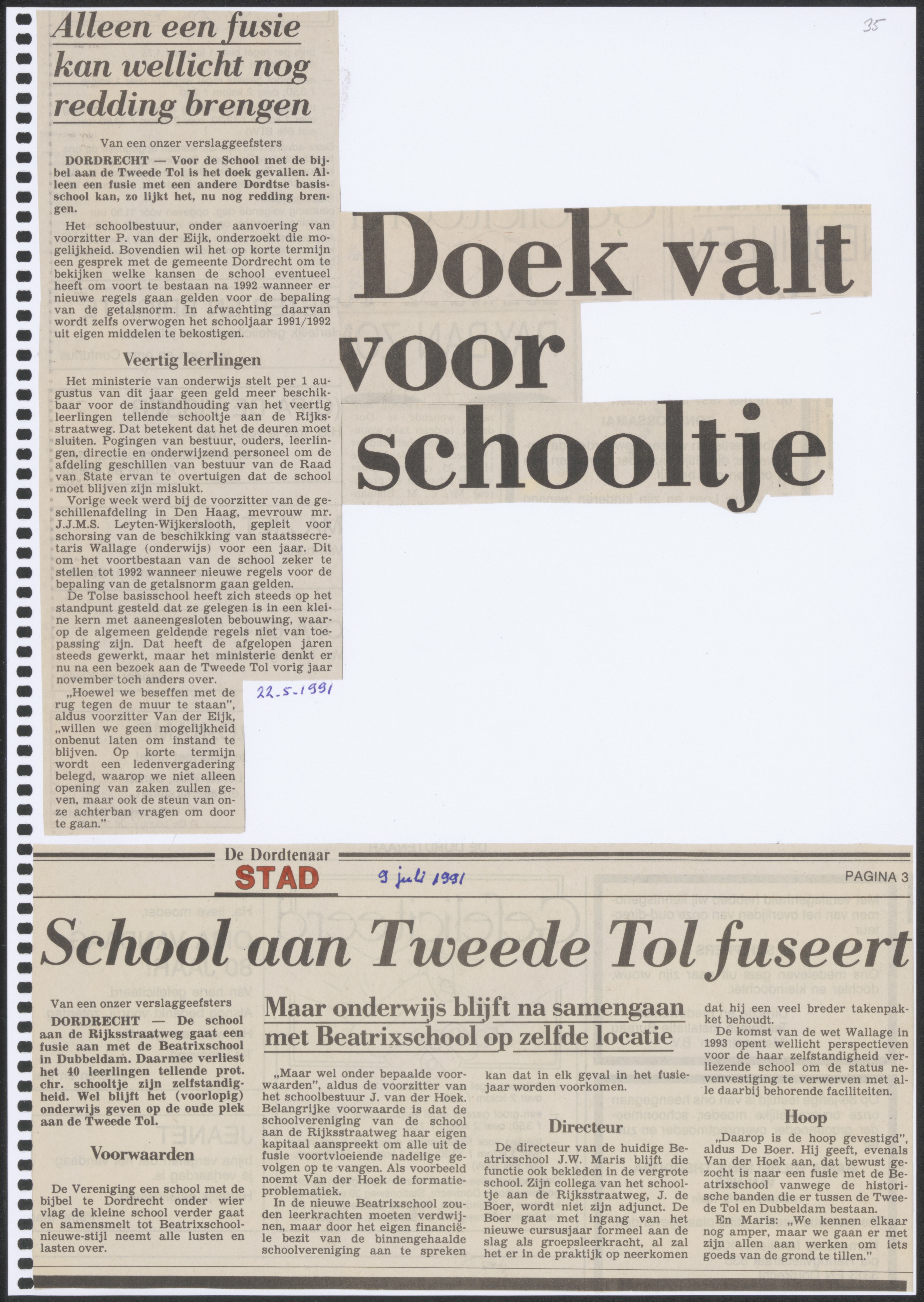 - Krantenberichten over de sluiting van de christelijke school Tweede Tol aan de Rijksstraatweg en het samengaan met de Beatrixschool.