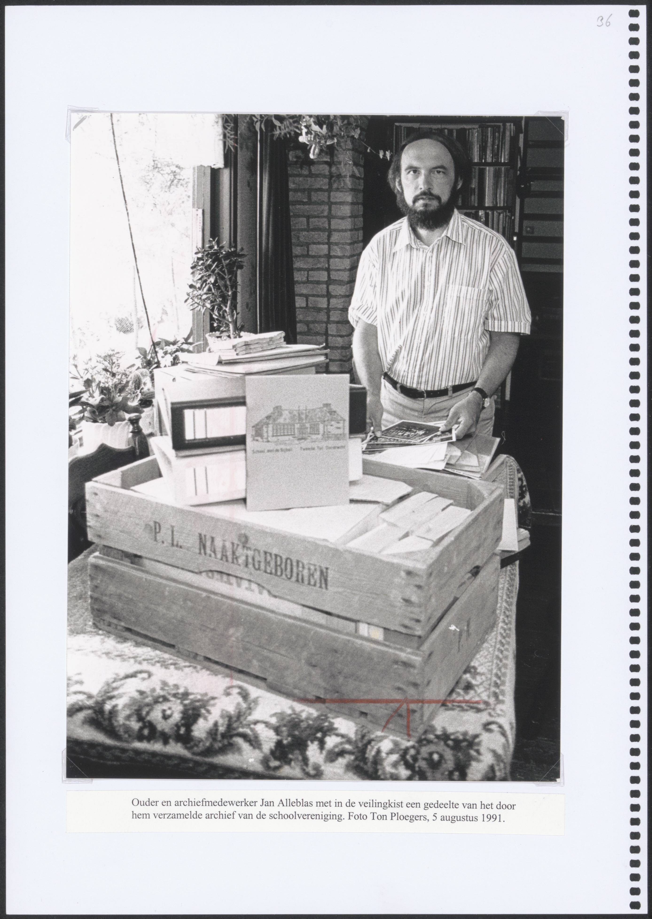 - Archivaris Jan Alleblas met een gedeelte van het door hem verzamelde archief van de christelijke school Tweede Tol aan de Rijksstraatweg.