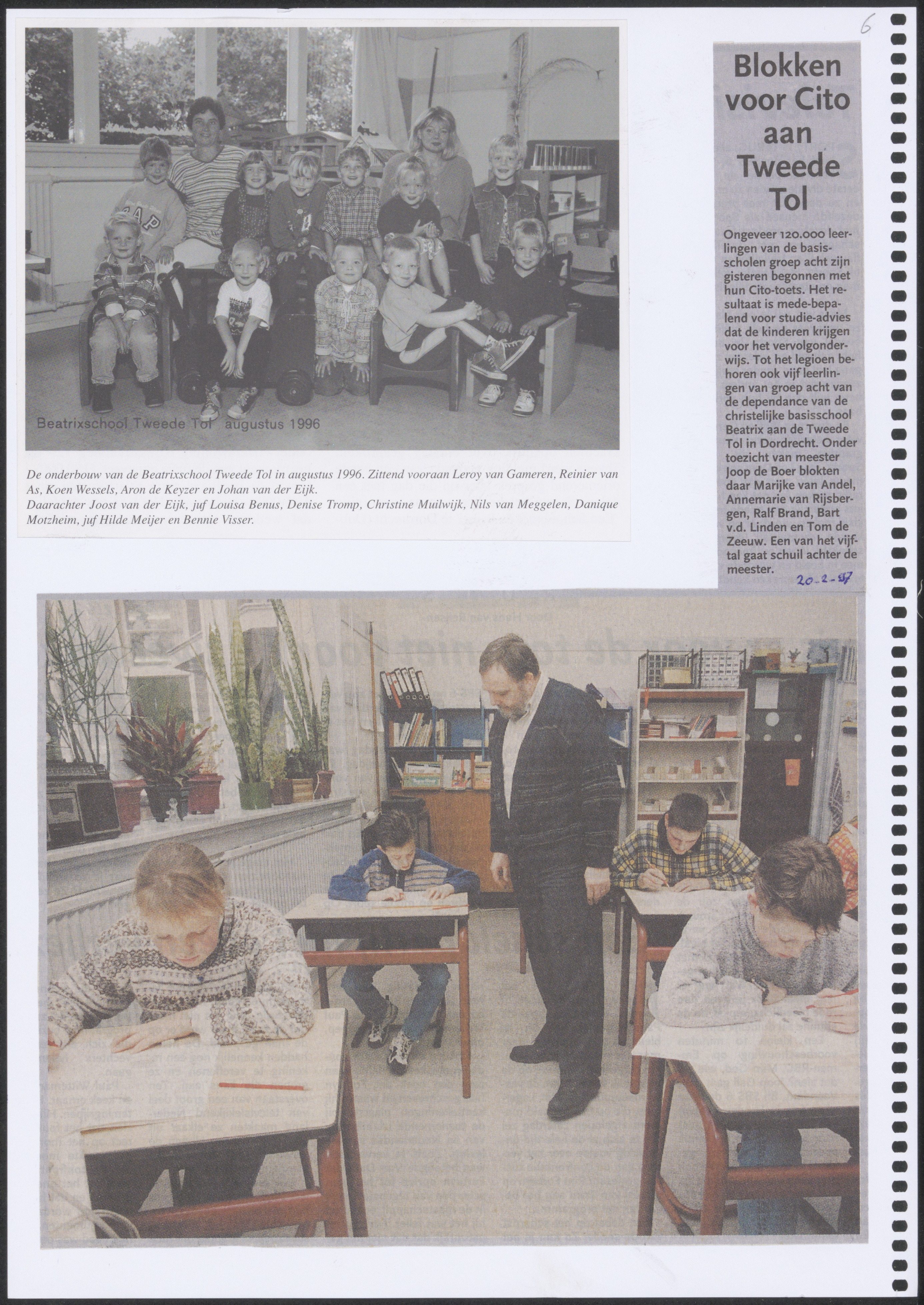 - Boven: Klassenfoto van de onderbouw in 1996 van de christelijke school Tweede Tol aan de Rijksstraatweg. Onder: Krantenartikel over leerlingen van groep 8 tijdens de CITO-toets.