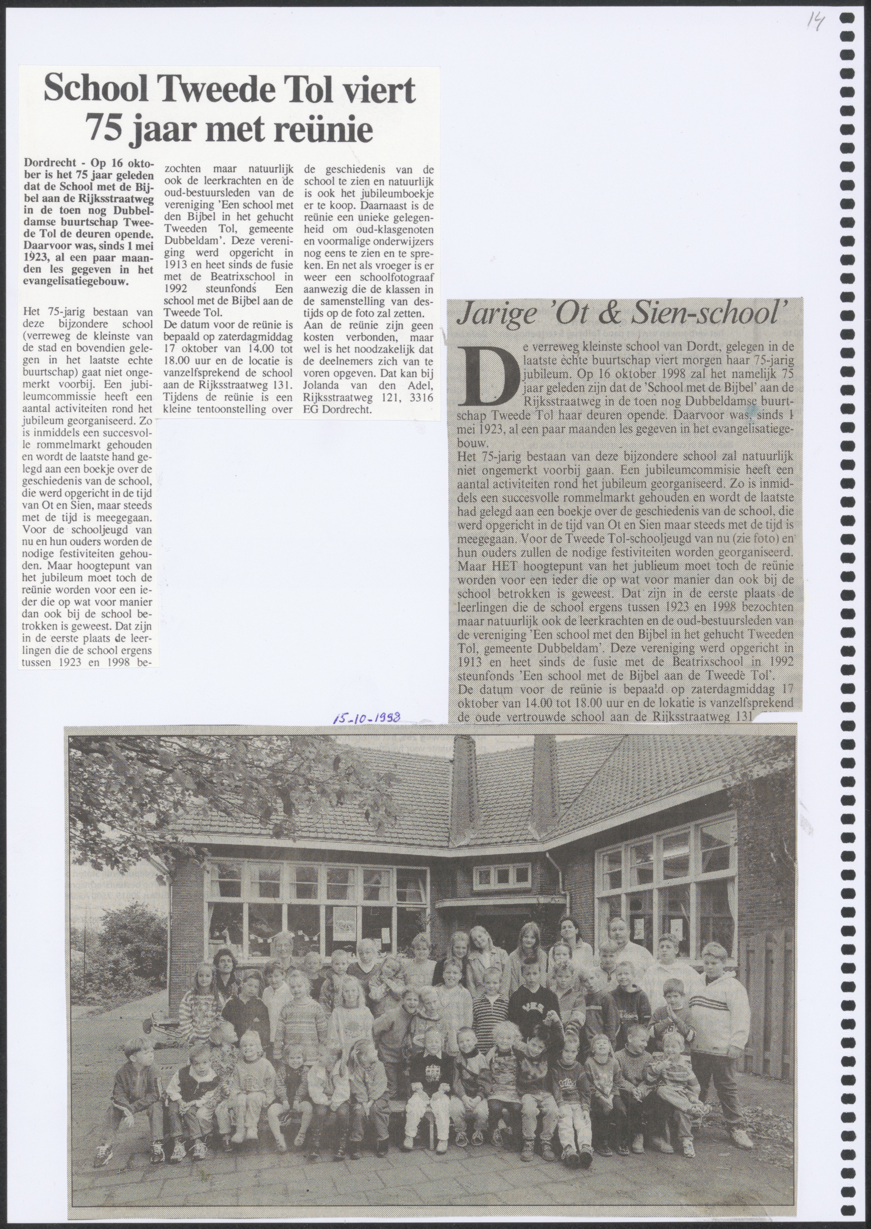 - Krantenartikel over het 75-jarig bestaan van de christelijke school Tweede Tol aan de Rijksstraatweg.