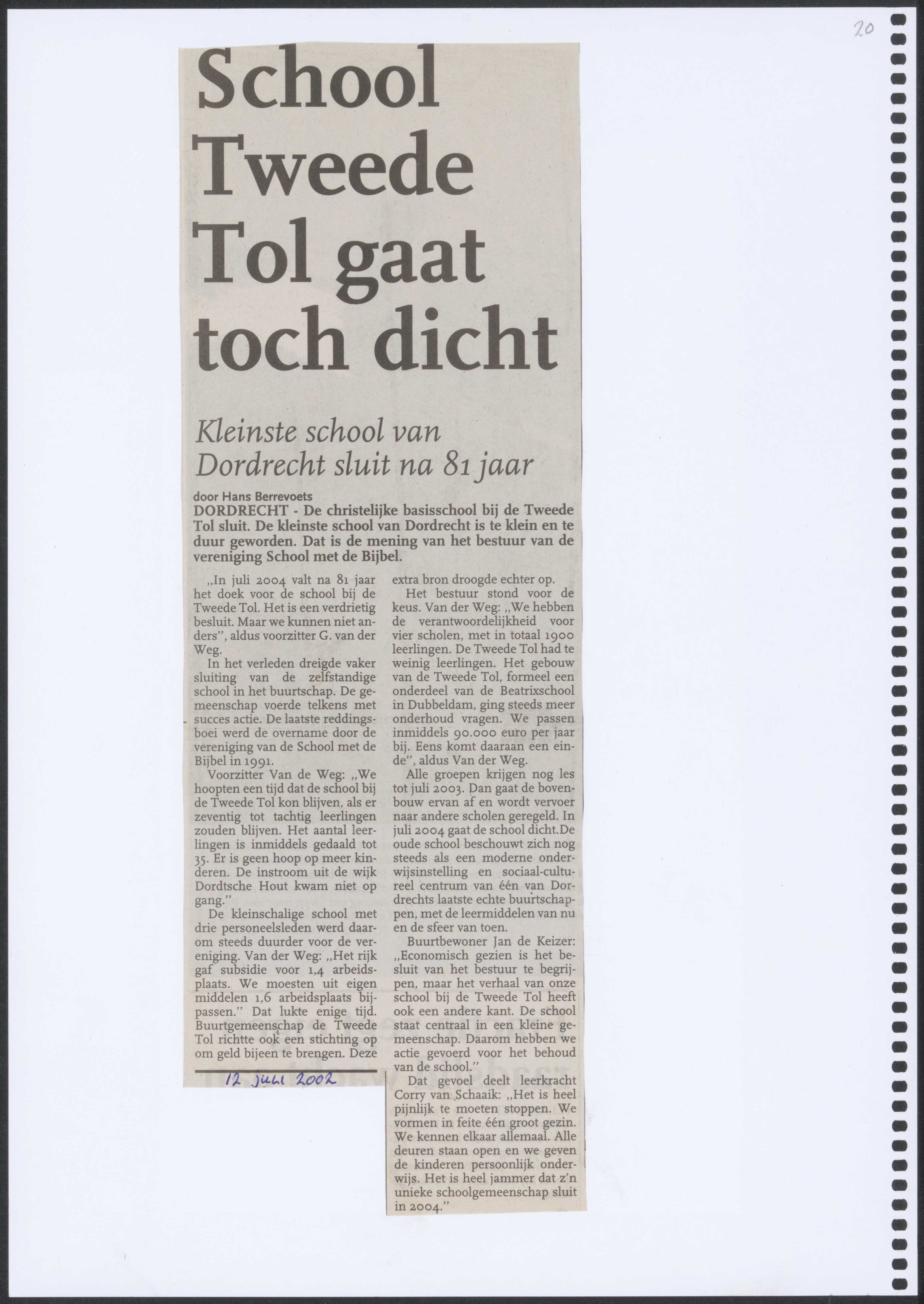 - Krantenartikel over de sluiting van christelijke school Tweede Tol aan de Rijksstraatweg.
