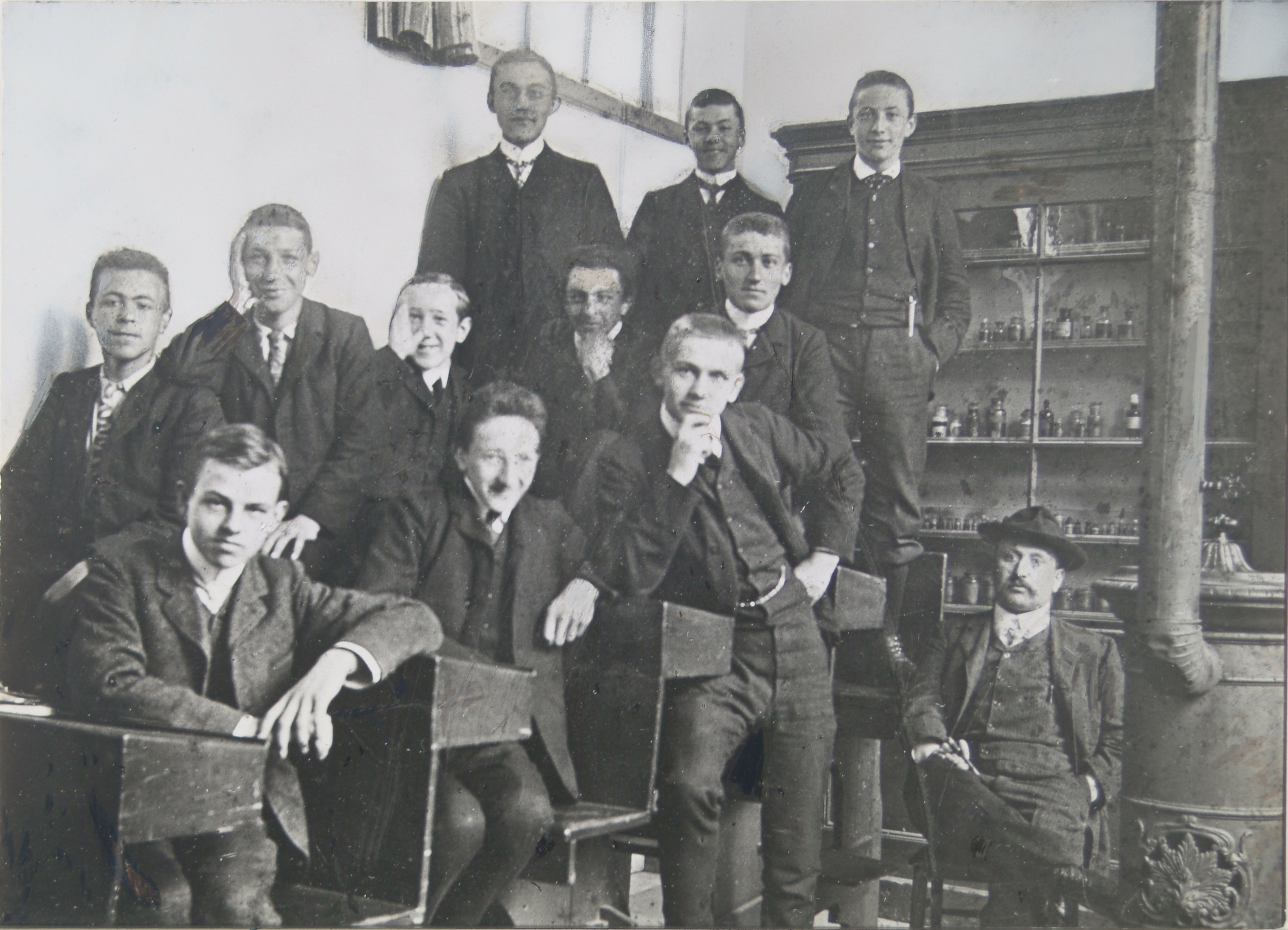 - Groepsportret van een klas in het scheikundelokaal op de H.B.S., leerjaar 1904 1905