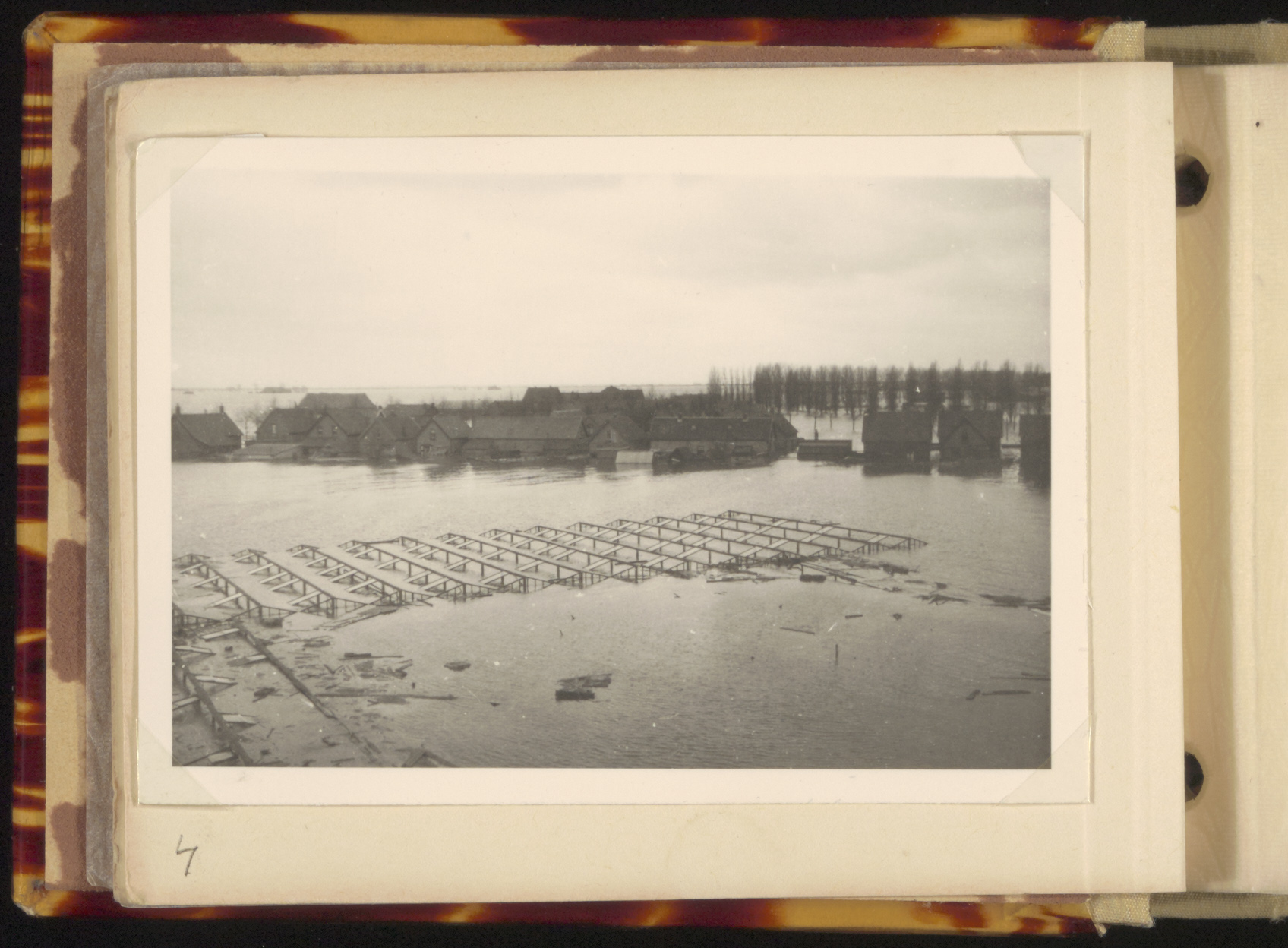 - Ondergelopen gebied met kassen in 's-Gravendeel, gezien vanaf molen Het Vliegend Hert tijdens de watersnood. Rechts de Maasdamseweg en links de Kooijstraat.