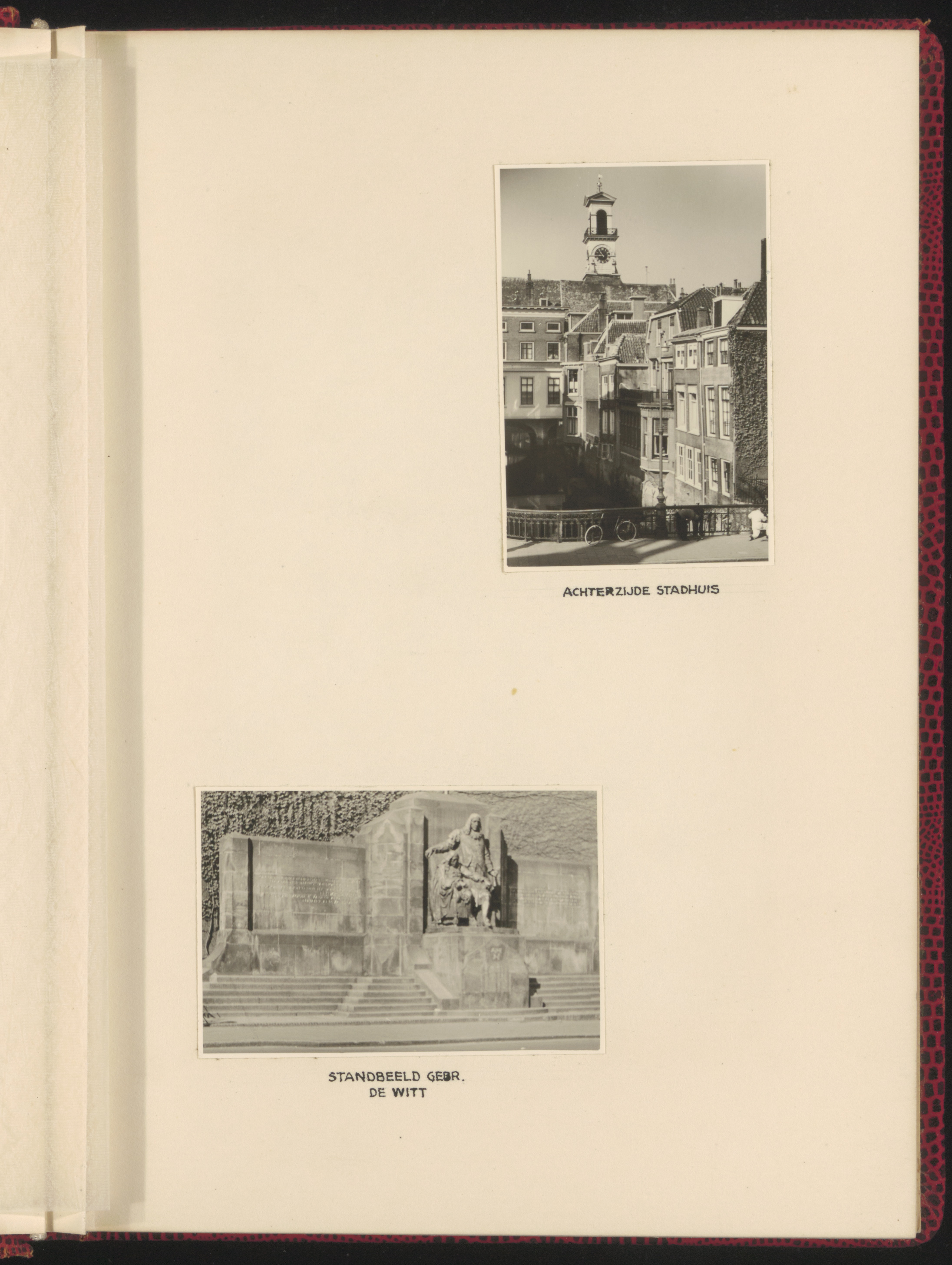 - Boven: Stadhuis, gezien vanaf de Visbrug. Rechts de Groenmarkt. Onder: Standbeeld van Johan en Cornelis de Witt op de Visbrug.