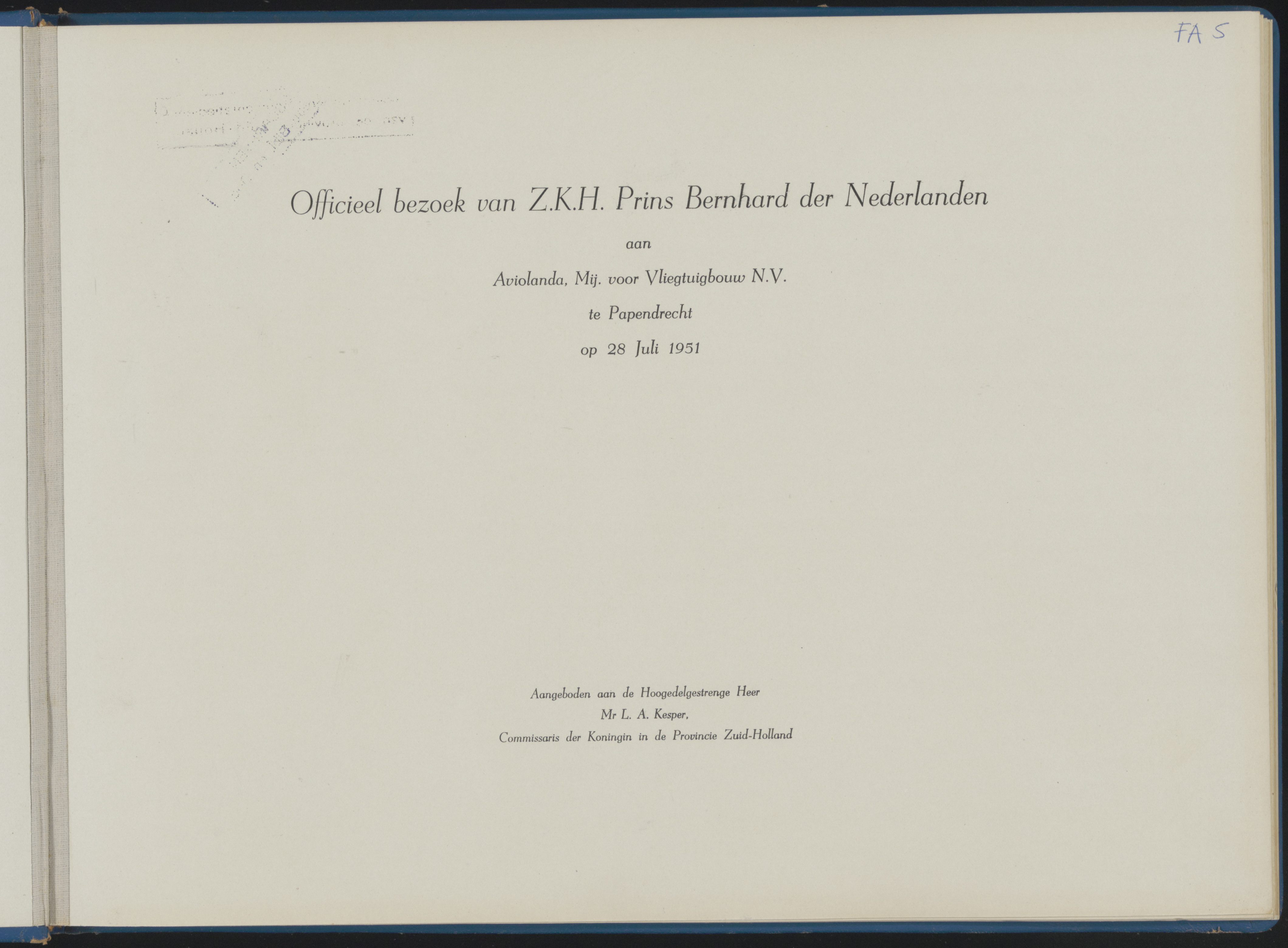 - Titelblad van album met foto's van het bezoek van prins Bernhard aan vliegtuigfabriek Aviolanda in Papendrecht, 28 juli 1951.