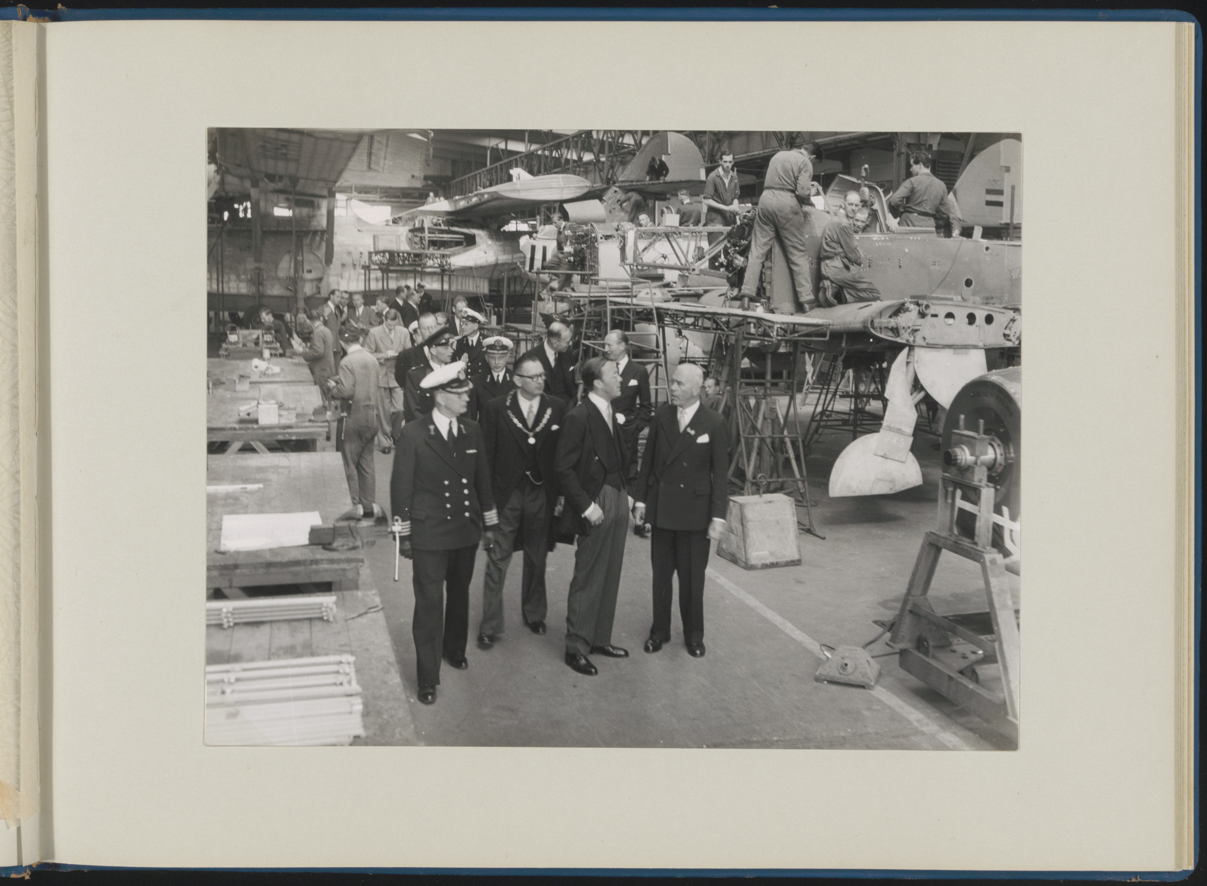 - ambtsketens burgemeesters fabriekshallen koninklijke bezoeken militairen / soldaten personeel / werknemers vliegtuigbouw