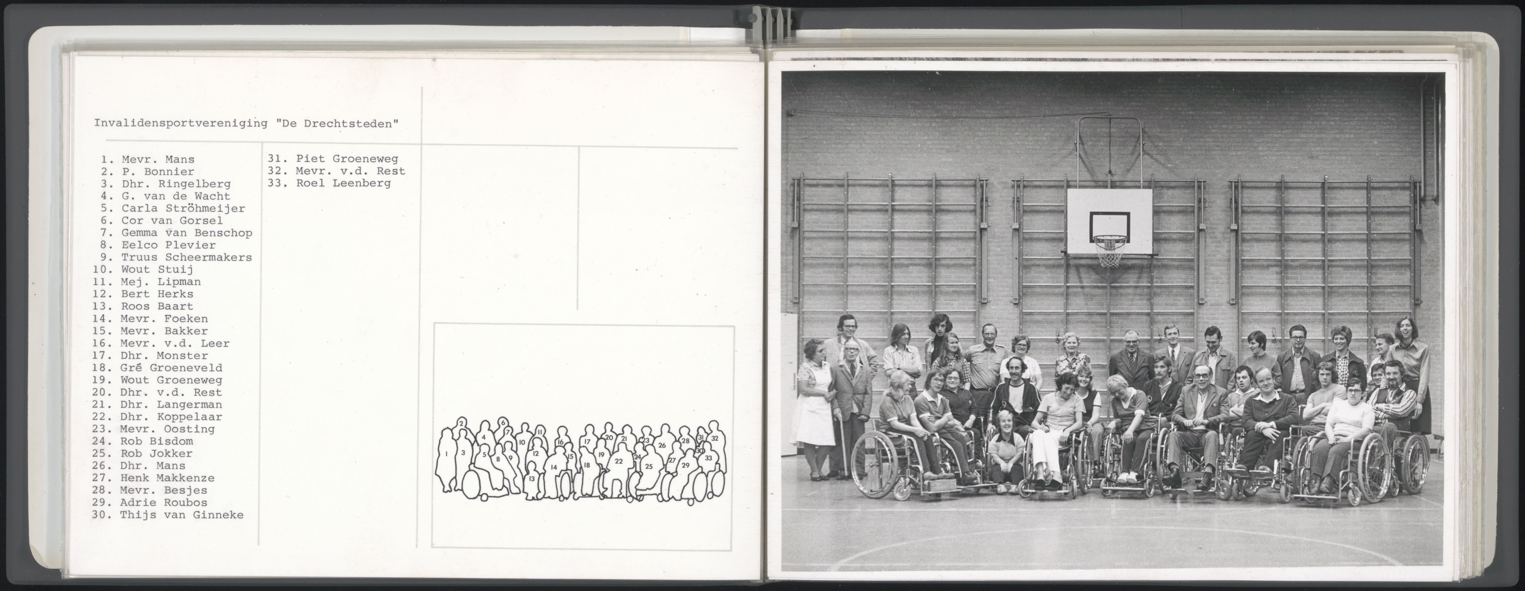 - Leden van Invalidensportvereniging De Drechtsteden. 1. mw Mans, 2. P. Bonnier, 3. hr Ringelberg, 4. G. v.d. Wacht, 5. Carla Ströhmeijer, 6. Cor van Gorsel, 7. Gemma van Benschop, 8. Eelco Plevier, 9. Truus Scheermakers, 10. Wout Stuij, 11. mj Lipman, 12. Bert Herks, 13. Roos Baart, 14. mw Foeken, 15. mw Bakker, 16. mw Van de Leer, 17. hr Monster, 18. Gré Goeneveld, 19. Wout Groeneweg, 20. hr Van de Rest, 21. hr Langerman, 22. hr Koppelaar, 23. mw Oosting, 24. Rob Bisdom, 25. Rob Jokker, 26. hr Mans, 27. Henk Makkenze, 28. mw Besjes, 29. Adrie Roubos, 30. Thijs van Ginneke, 31. Piet Groeneweg, 32. mw Van de Rest, 33. Roel Leenberg.
