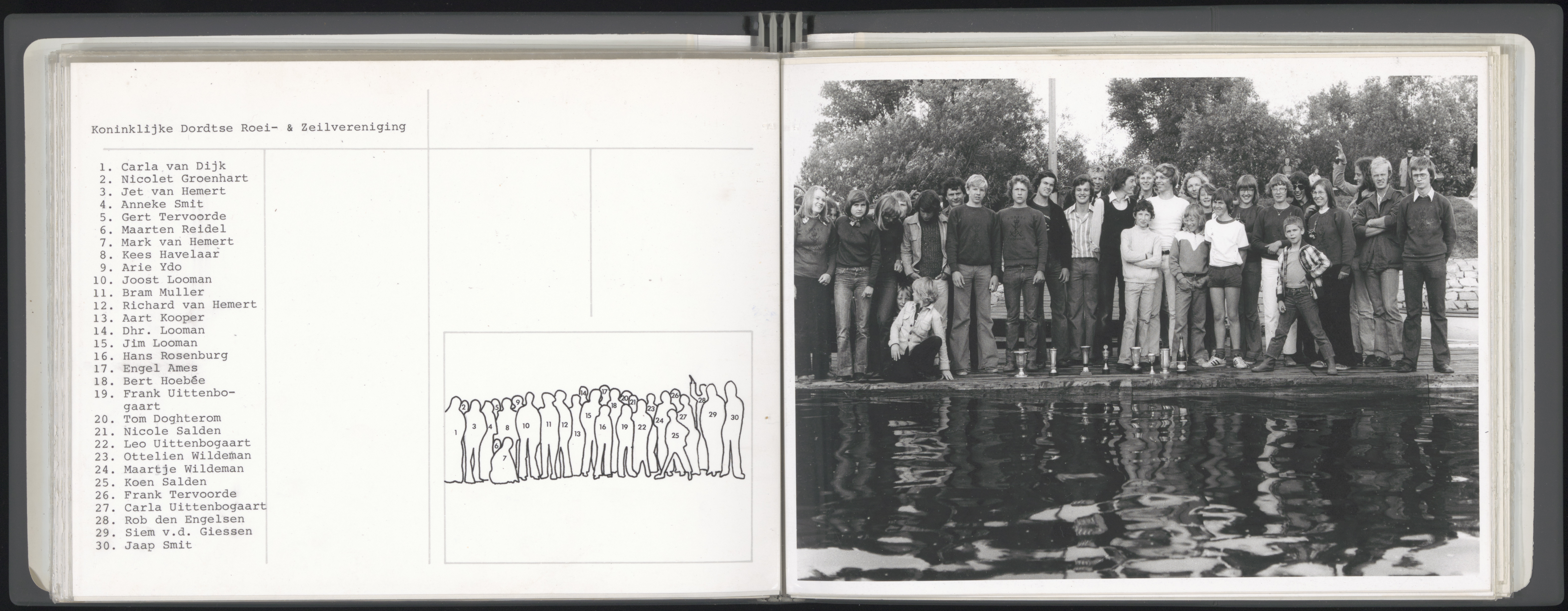 - Leden van de Koninklijke Roei- en Zeilvereniging. 1. Carla van Dijk, 2. Nicolet Groenhart, 3. Jet van Hemert, 4. Anneke Smit, 5. Gert Tervoorde, 6. Maarten Reidel, 7. Mark van Hemert, 8. Kees Havelaar, 9. Arie Ydo,10. Joost Looman, 11. Bram Muller, 12. Richard van Hemert, 13. Aart Kooper, 14. hr Looman, 15. Jim Looman, 16. Hans Rosenburg, 17. Engel Ames, 18. Bert Hoebee, 19. Frank Uittenbogaart, 20. Tom Dogterom, 21. Nicole Salden, 22. Leo Uittenbogaart, 23. Ottelien Wildeman, 24. Maartje Wildeman, 25. Koen Salden, 26. Frank Tervoorde, 27. Carla Uittenbogaart, 28. Rob den Engelsen, 29. Siem v.d. Giessen, 30. Jaap Smit.