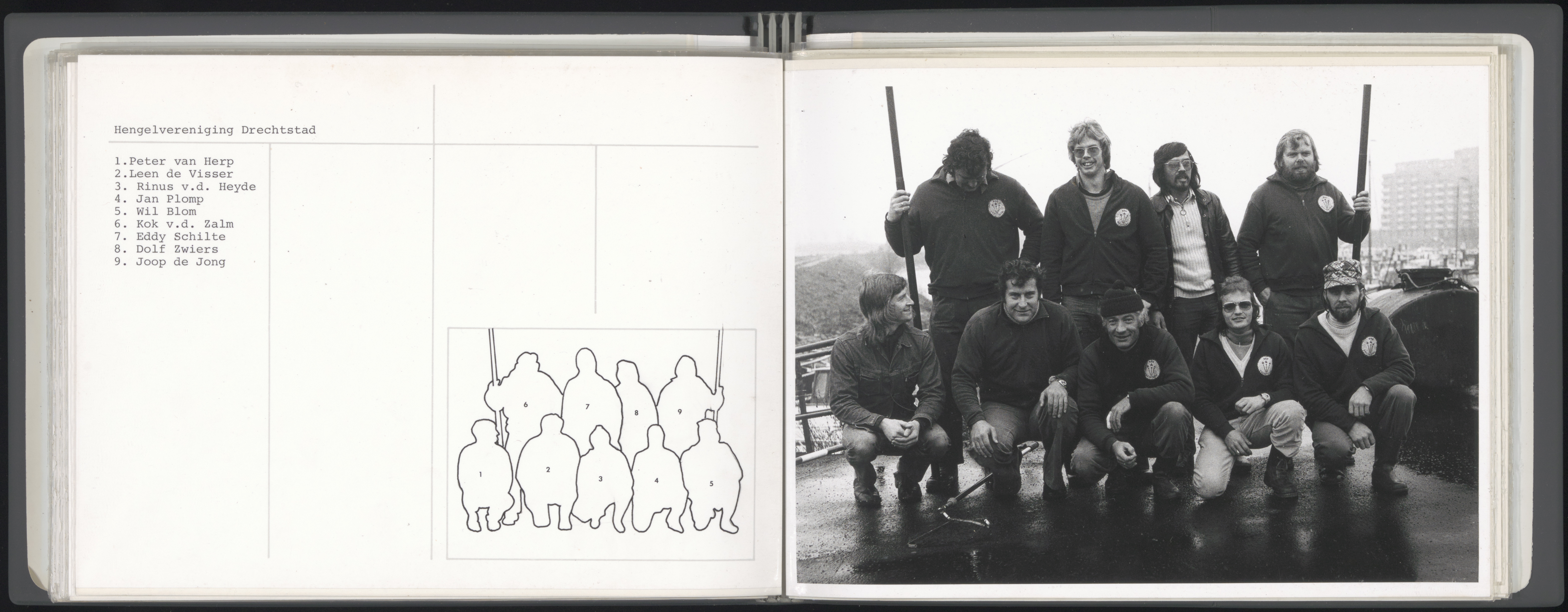 - Leden van hengelvereniging Drechtstad. 1. Peter van Herp, 2. Leen de Visser, 3. Rinus v.d. Heyde, 4. Jan Plomp, 5. Wil Blom, 6. Kok v.d. Zalm, 7. Eddy Schilte, 8. Dolf Zwiers, 9. Joop de Jong.