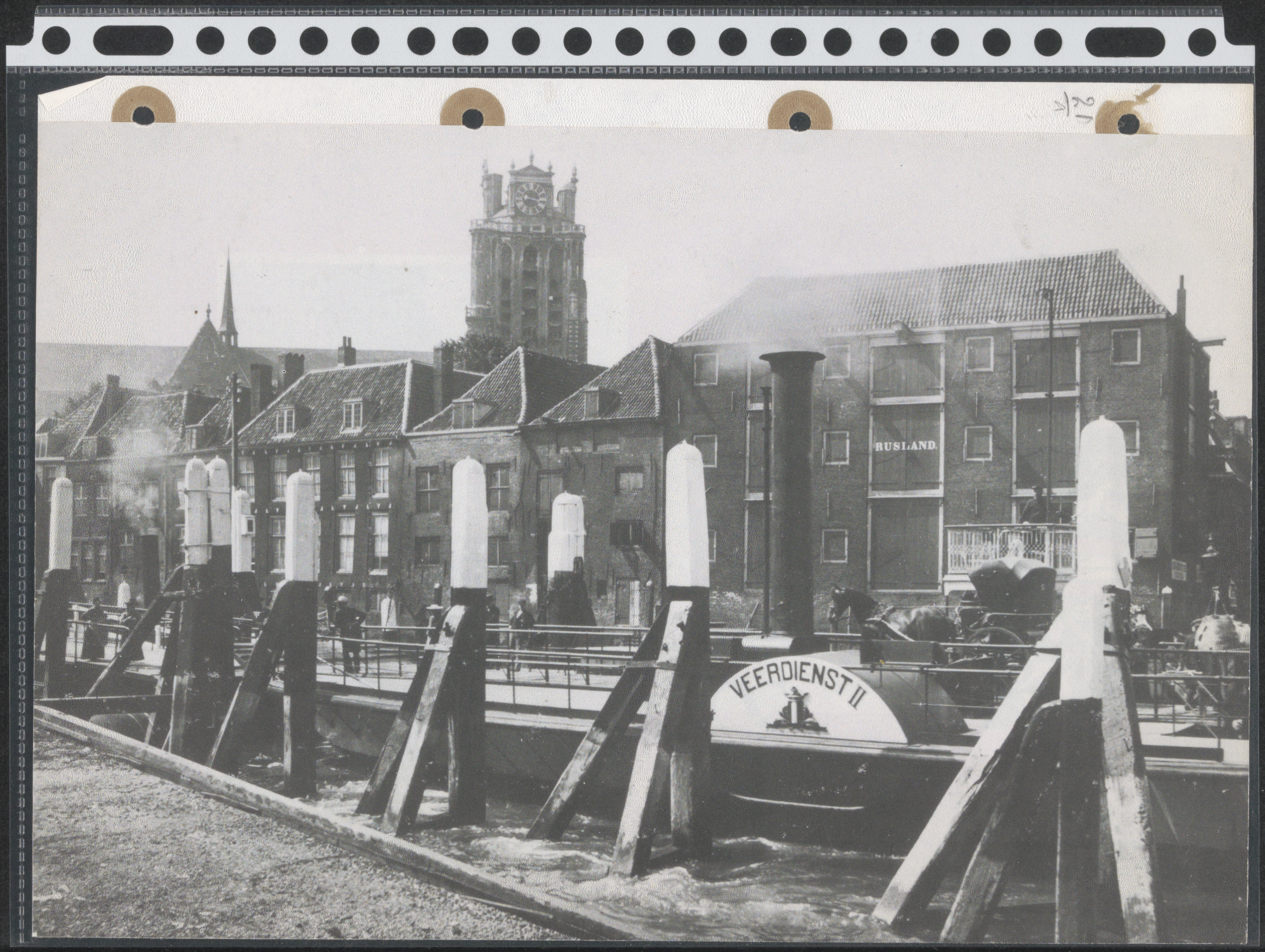 - Stoomraderveerboot Veerdienst II aan de steiger van het Zwijndrechts veer bij het Blauwpoortplein. De huizen staan op de Korte Engelenburgerkade; rechts pakhuis Rusland.