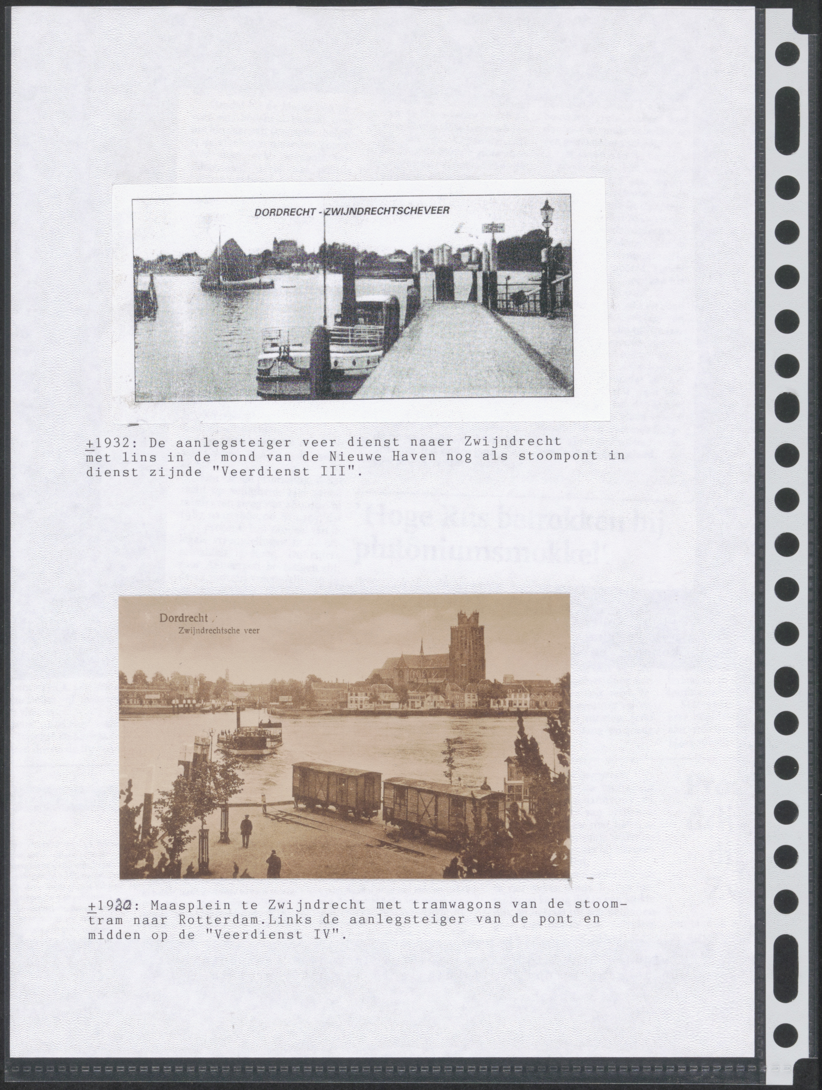 - Boven: De pont Veerdienst III naast de steiger van het Zwijndrechts veer. Onder: De Veerdienst VIII op de Oude Maas en goederenwagons op het Veerplein in Zwijndrecht.