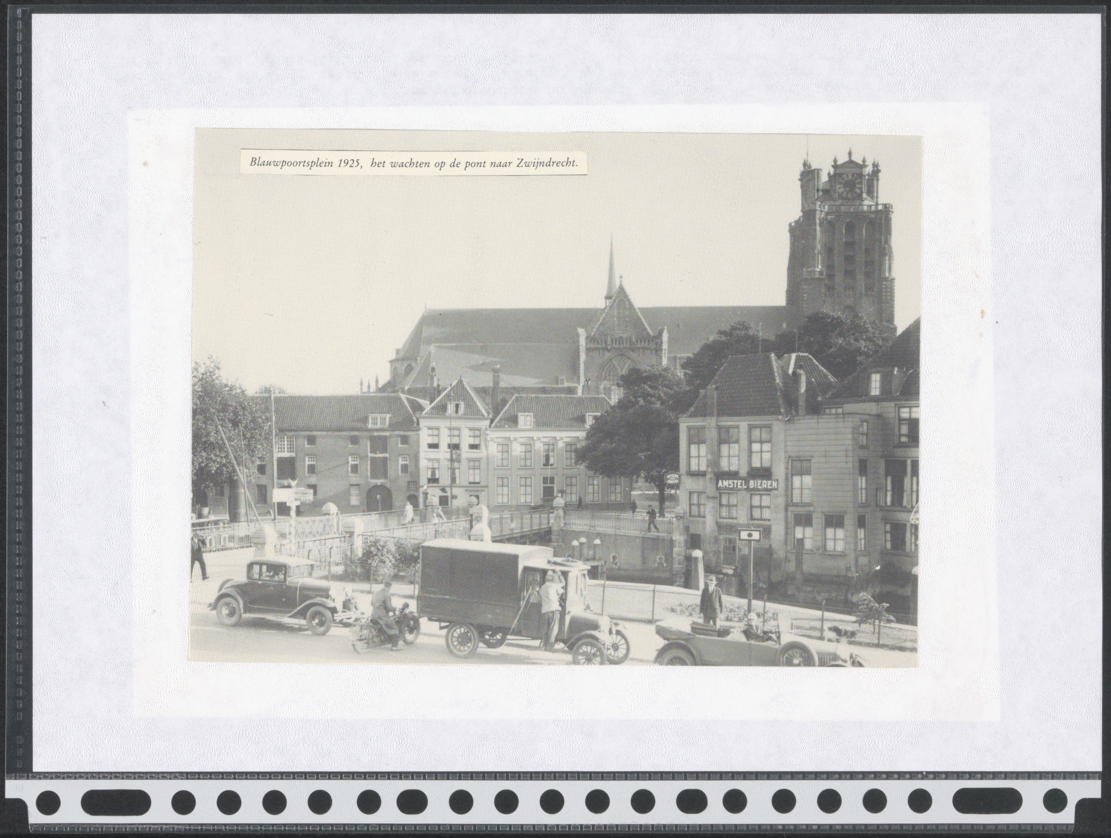 - Verkeer op het Blauwpoortsplein bij de Engelenburgerbrug over de Nieuwe Haven wacht op de overtocht met de pont naar Zwijndrecht. Op de achtergrond het Rijksmagazijn aan de Houttuinen, daarachter de Grote Kerk en rechts de Korte Engelenburgerkade.